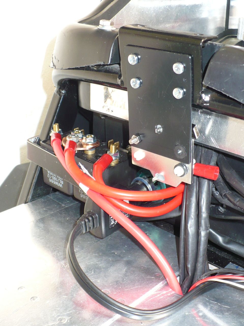 Was ich wohl schon in meiner letzten Mail hätte erwähnen sollen, ist das der Li-ion Akku mit 2 Anderson-Steckern direkt hinter den Sicherungsboxen geliefert wurde (etwa da, wo der blaue Schrumpfschlauch anfängt). Und die hab' ich dann eben abgemacht und statt dessen die längeren schwarzen und roten 10mm²-Kabel angelötet (nur ein paar dieser Stecker ist sicher sinnvoller als zwei, meinte zumindest mein E-Roller Händler). Inzwischen sind die natürlich auch abgemacht, da die Kabel per Ringkabelschuhe an Relais 1 (Plus) und den Shunt (Minus) angeschlossen werden.