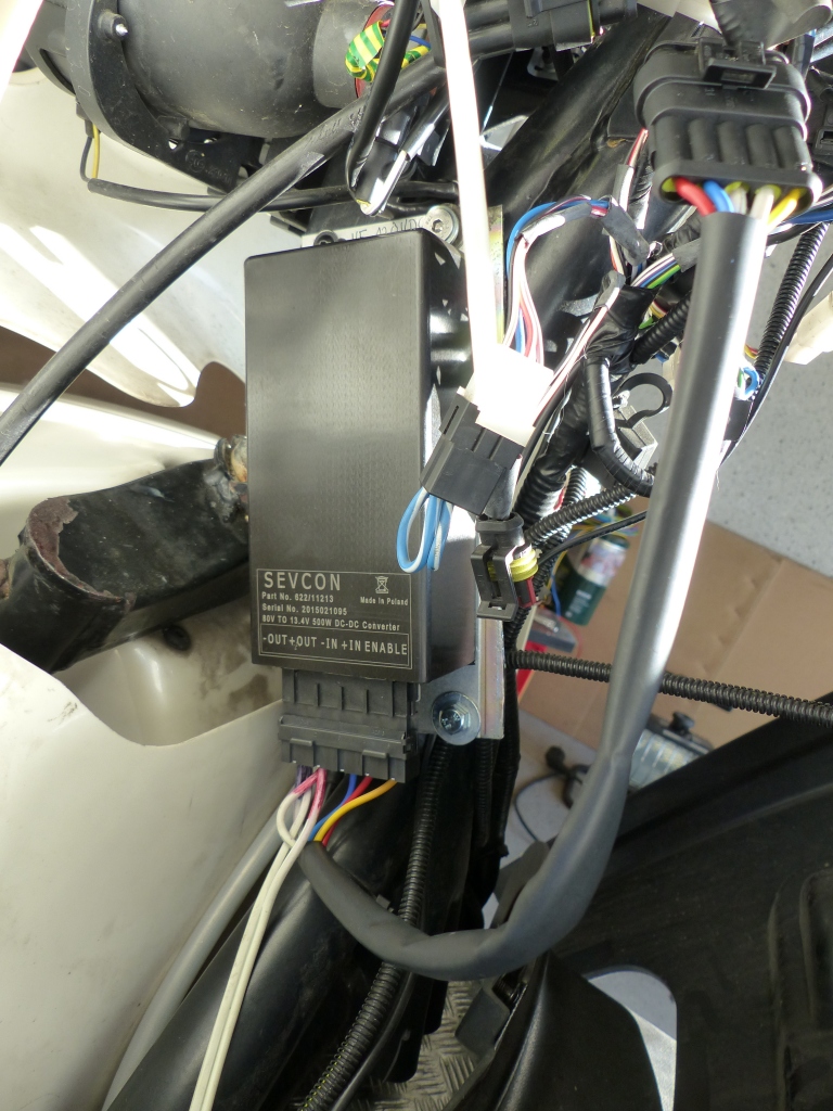 Hier noch die Bilder vom Umbau von A.T.I.B. Eletrtonica 50W / 11,6V DC-DC-Wandlerlein auf "Real Man" BorgWarner/Sevcon 500W / 13,4V (eigentlich 13,7V...) DC-DC-Wandler!