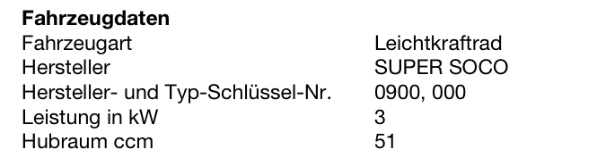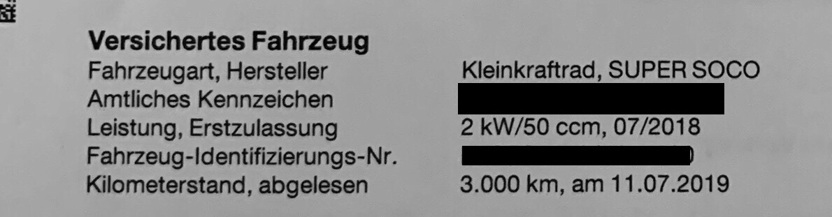 Leistung in der COC liegt bei 1,9 kW , im Fz-Schein für die Soco TC hat die Zulassungsstelle hier bei uns 2 kW eingetragen - kann sein, dass der Beitrag für die Versicherung auch von der Leistung abhängig ist? Wobei zwischen 2 und 3 wird wohl kein großer Unterschied bestehen, nichtsdestotrotz sind mMn 1,9 bzw 2 kW richtig, 3000 W ist nämlich das Maximum, was der Motor her gibt, nominale Leistung liegt bei 1,9 kW.