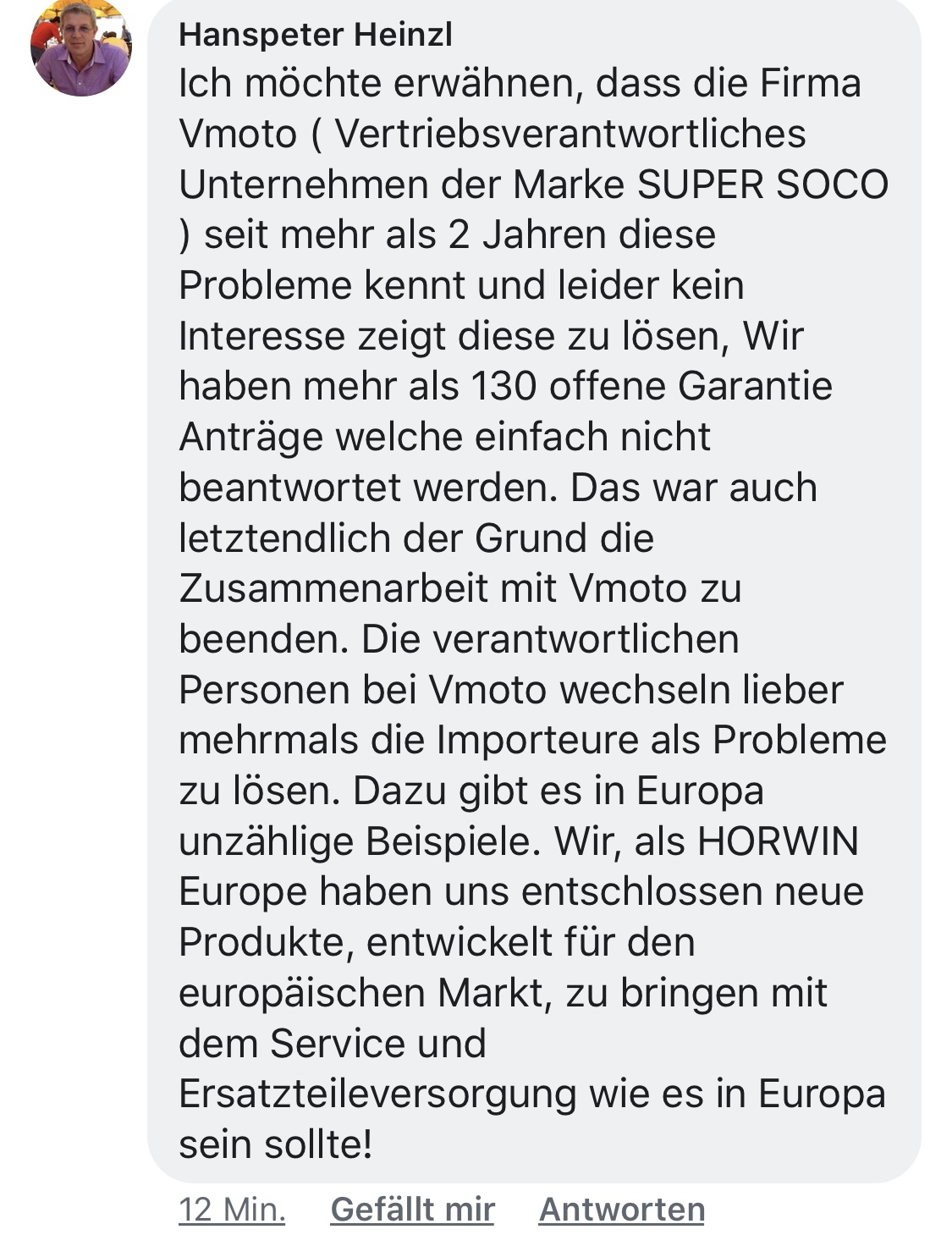 Ich will hier auch echt nicht ständig wie der PR-Troll von Soco/Leeb/etc klingen. Ich bin selber der Meinung, ein paar Dinge müssen optimiert werden, was ja auch bereits passiert. Ändert aber nichts an den Dimensionen: große Mengen tadellos fahrender Bikes einerseits, einige wenige (trotzdem zu viele!) Einzelstücke, die anscheinend bestimmten Fahrsituationen nicht (oder nicht dauerhaft) gewachsen sind. Ärgerlich für die Betroffenen, erst recht, wenn gepaart mit langsamen oder lustlosen Händlern. Aber ich bin dagegen, daraus gleich eine pauschale Frage der Produktqualität oder der Importeurseriosität oder gar der Betriebserlaubnis zu machen. „Verhältnismäßigkeit“ ist ein sehr wertvolles Wort, finde ich!