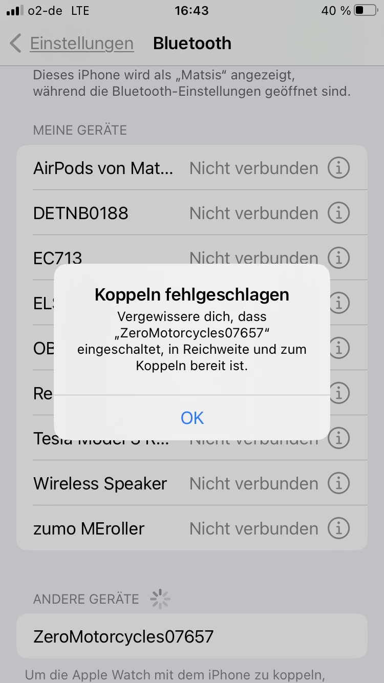 Nach Heimkunft vom PaceRace 2024, mit stundenlanger Nutzung der Bluetooth Verbindung zu meiner Zero, startet sie jetzt die Bluetooth- Rune nicht mehr automatisch nach Schlüsseldreh, und auch nach manuellem Start durch langes Drücken der Mode Taste blinkt zwar die Rune, die Zero wird von Handys auch gefunden, aber mit der Nextgen-App verweigert sie standhaft die Kopplung, und bricht mit folgendem Fehler ab, obwohl das Handy Blauzahn an hat, alle nötigen Berechtigungen der App gegeben wurden, und es direkt über Sitzbank gehalten wird: