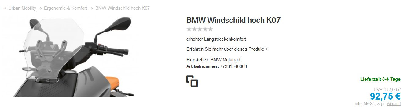 Bei der C400GT bleibt es hinter der hohen Scheibe sehr leise (und die ist auch kaum von der normalen zu unterscheiden), aber bei der CE04 würde eine so hohe Scheibe - die es sicher bald von Drittherstellern geben wird - nicht mehr wirklich gut aussehen ...