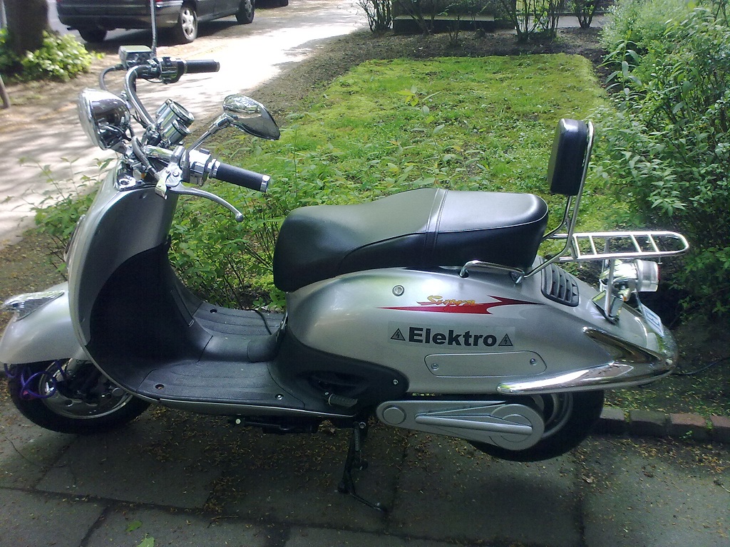 Einen gebrauchten Elektroroller, Marke Chinsun, Type TD690Z, Crusier (siehe Bild), Kaufdatum Mai 2011 (Rechnung vorhanden), ca. 1.400km (wird noch benutzt), silber, Motorleistung 1500 W (max. 1800W, Bürstenlos), Geschwindigkeit max. 45km/h, Reichweite ca. 30KM (abhängig von Fahrsituation), auf LED-Blinker und -Schlußlicht umgerüsted (Rechnung vorhanden, Frontscheinwerferumrüstung nicht möglich), für 2 Personen zugelassen, Stauraum und der Sitzbank, Rückenlehne mit Reißverschluß, Fussmatte, inkl. Ladegerät (220V), mit Führerschein Leichtkraftrad oder PKW, Mofaversicherung, Batterie Bleigel 72V/20AH, Vorne Scheibenbremse, Hinten Trommenbremse, an Selbstabholer, Probefahrt in Hamburg möglich.