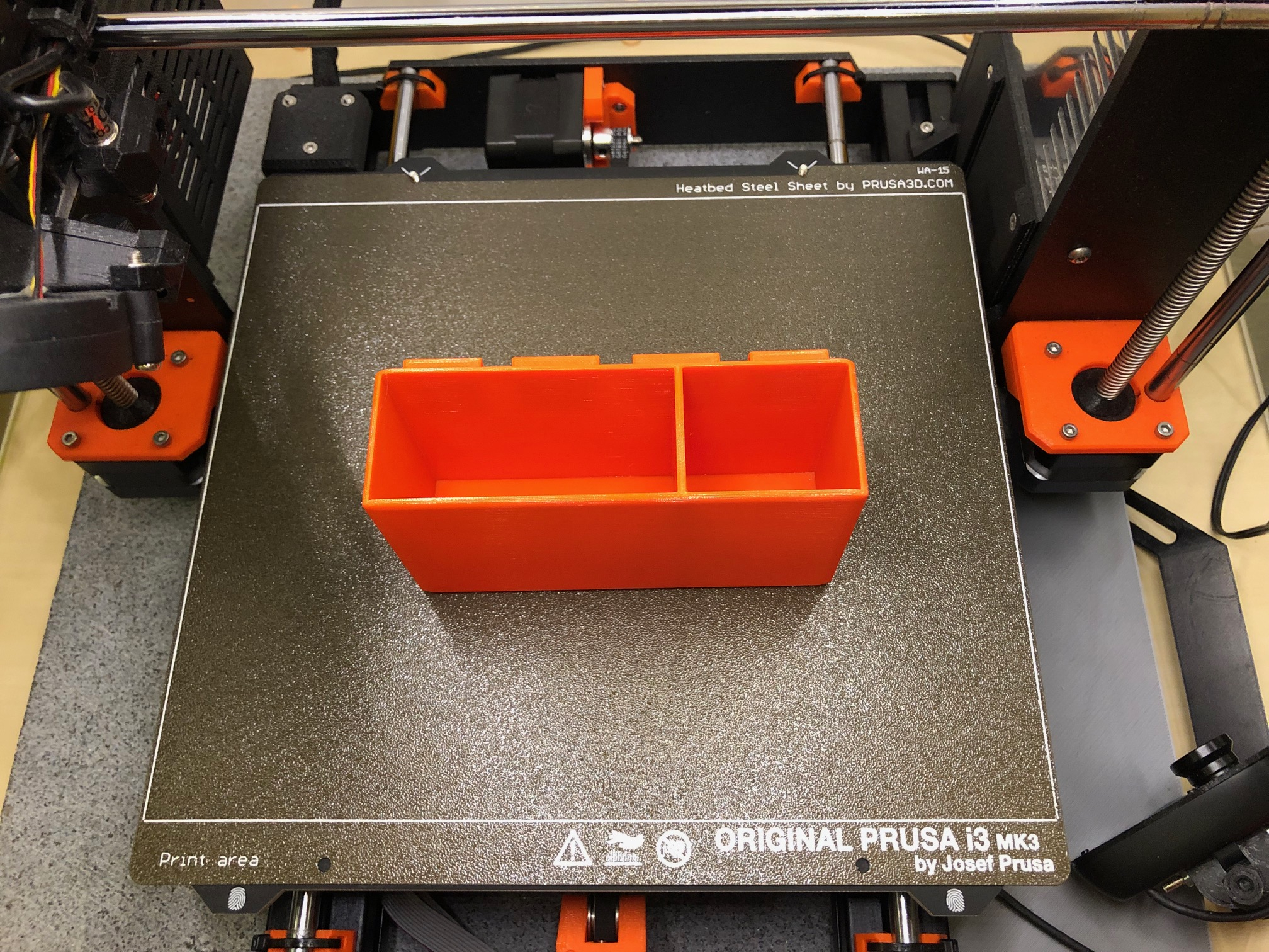 Gedruckt habe ich in PETG (Prusament Orange), von PLA nehmt Abstand, da im Sommer das Case sehr stark aufheizen kann und es nicht hitzebeständig ist.