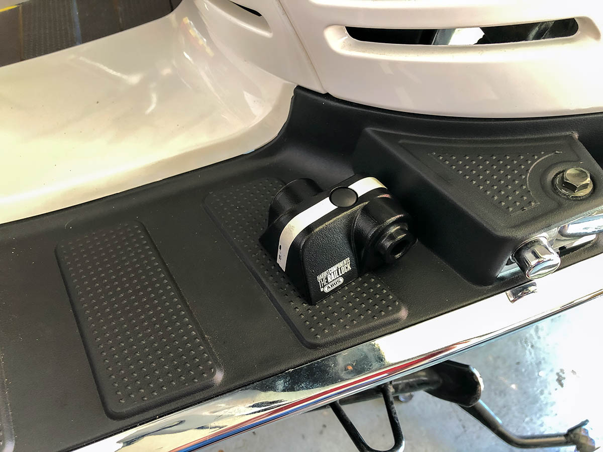 Als Befestigungsanker passte genau die Rahmenschraube im hinteren Fussbereich, wo man eh die Füße nicht hat. Der Sozius auch nicht; der hat eine eigene Fussraste. (Da ich nicht bohren musste ggf. auch wieder 100% rückbaubar.)