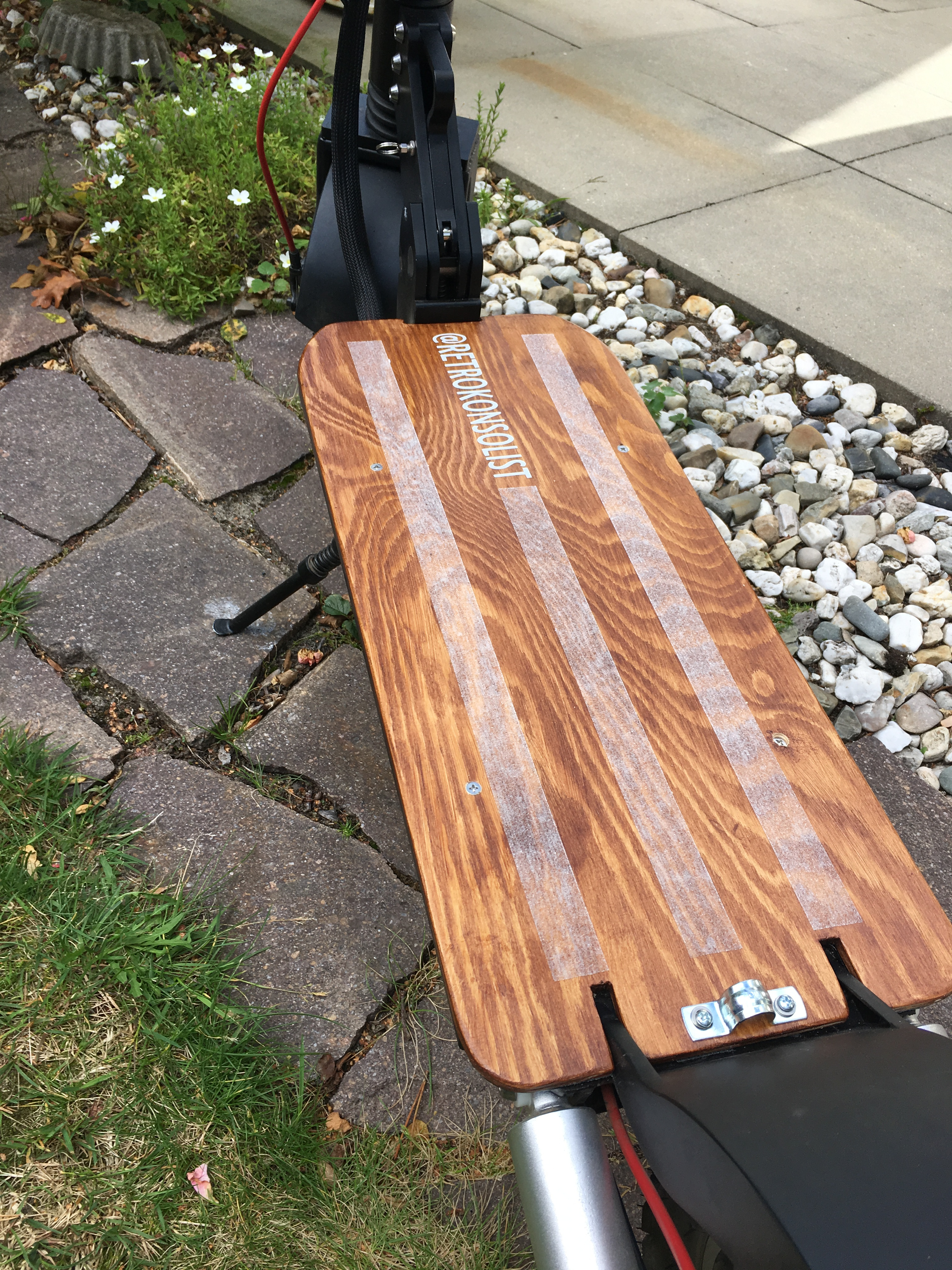 ich denke mal so etwa 3h. plus Trocknungszeiten. Das Brett, in diesem Fall Kiefer Multiplex habe ich mir im Baumarkt zurecht sägen lassen auf die Grundmaße. Dann die Aluplatte auflegen, alles nachzeichnen. Stichsäge und Stecheisen, Akkubohrer, dann alles Schleifen, Ecken abrunden, etc. Dann lasieren oder beizen, je nach Geschmack. Klarlack. Griptape transparent, ggfs. Aufkleber. Verschrauben, fertig.