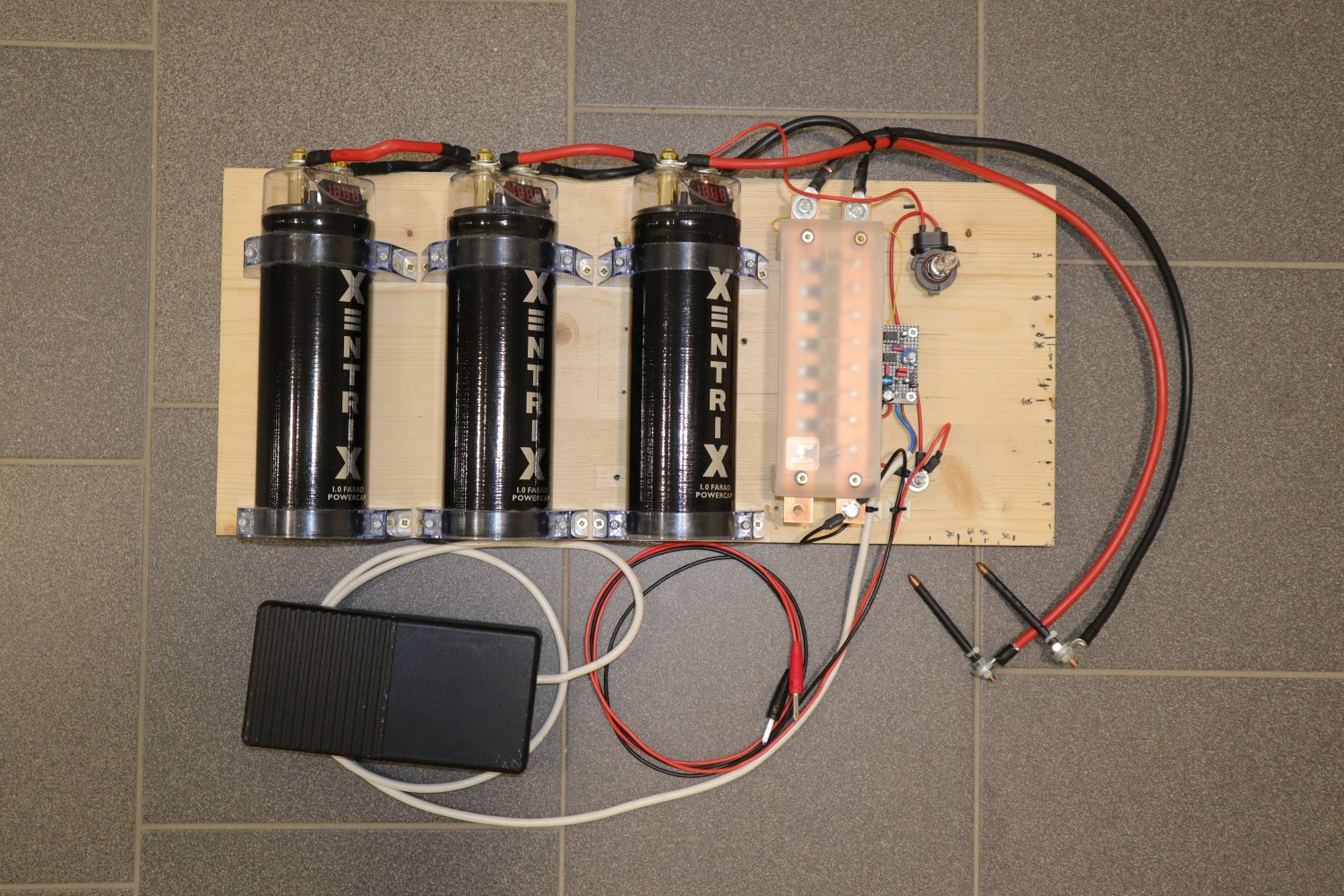 Punktschweißgerät Selbst gebaut auf Grundlage einer Beschreibung im Pedelec-Forum, bisher für E-Bike Akkus mit 30-60 Zellen verwendet. Bei 0,15mm dickem Nickelband reichen zwei von den dicken Kondensatoren. Weil ich aber auch Bänder mit 0,2 oder 0,3mm verarbeite, habe ich auf drei Kondensatoren aufgerüstet. Je nach Dicke des Bandes verändere ich die Versorgungsspannung im Bereich zwischen 13V und 18V.