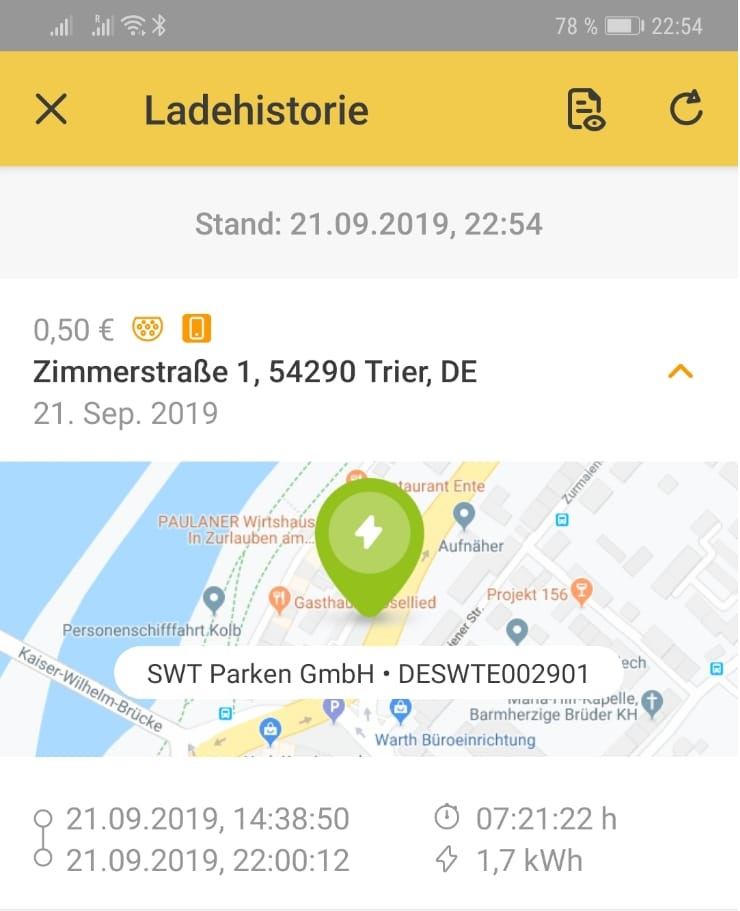 Wie Sie auf dem Bild sehen können, erhielt ich 1,7 kW, was 0,50 Euro Cent kostete.