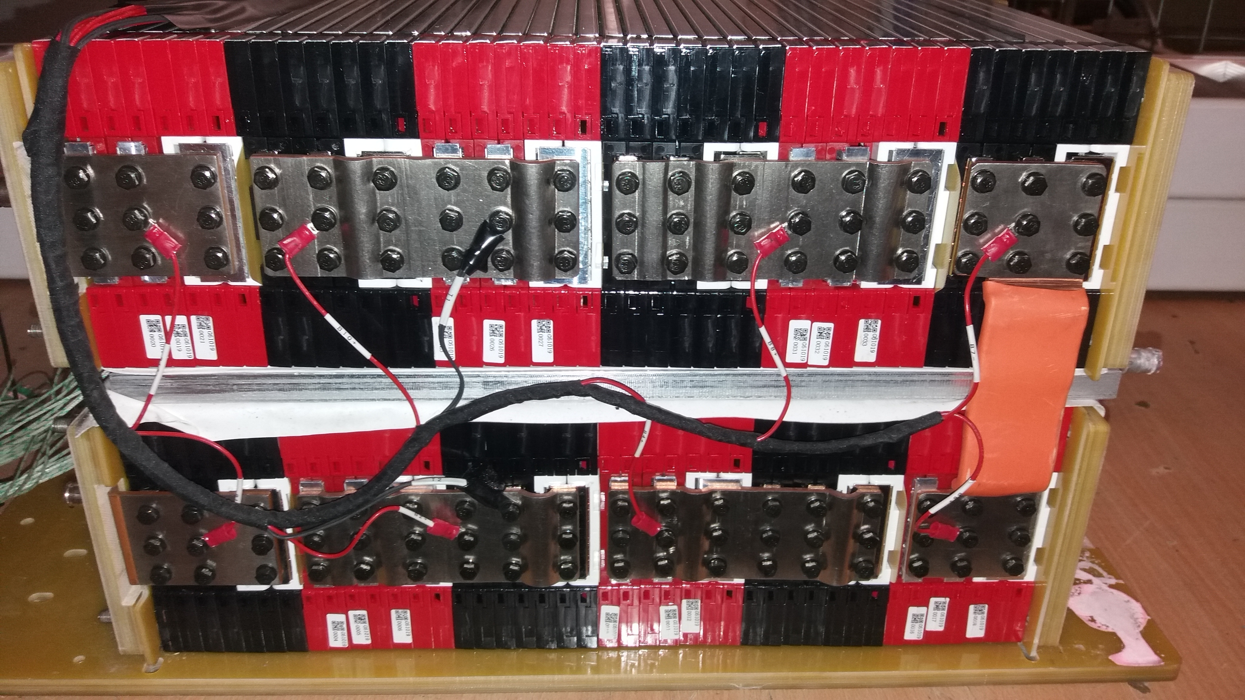In Summe habe ich 84Zellen in verschweißten 3er Packs, dies noch alles zusammengebaut in einem 14S6P Pack mit eingebauter Wasserkühlplatte in der Mitte zwischen den zwei 7S6P aufbauten, und noch mal zwei Zellen aus einem missglückten Versuch ein 3er Pack zu trennen. ;)