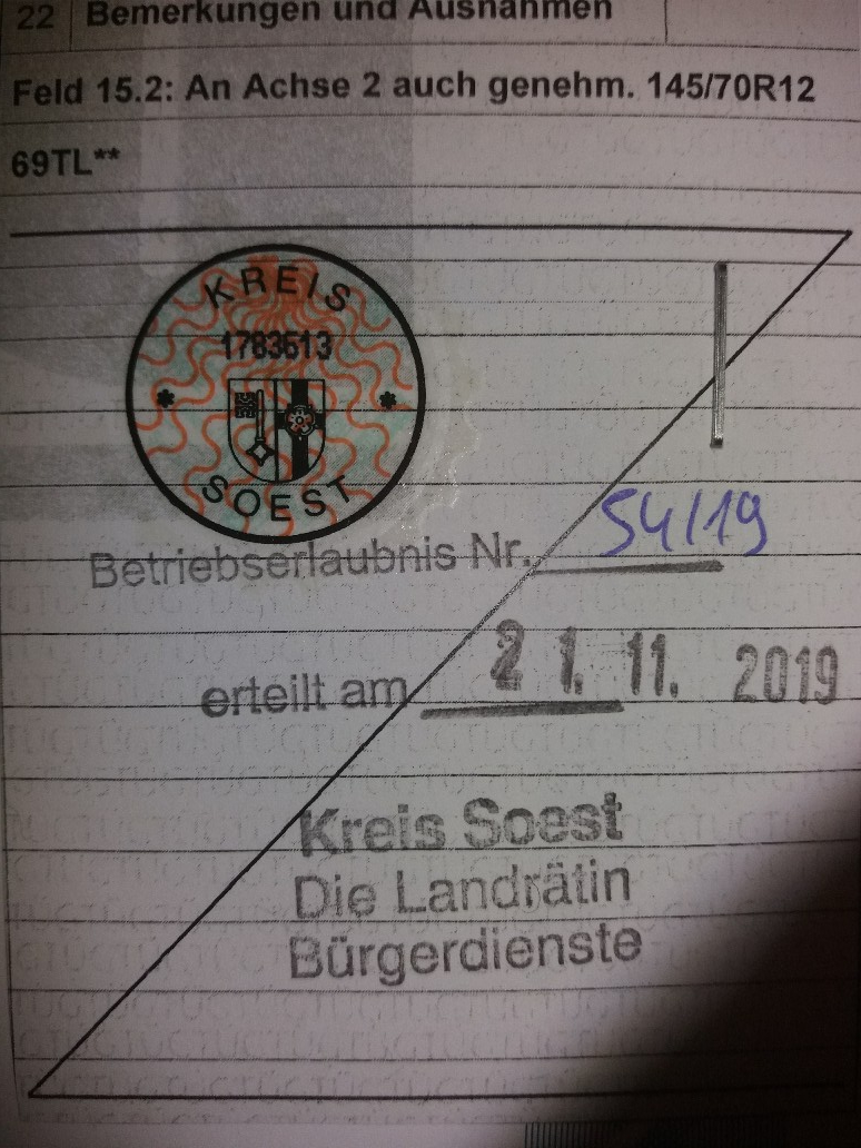 Ich verstehe nicht was Du meinst; ich habe trotz intensiver Nachfrage bei der Eintragung der Reifen keine besondere Betriebserlaubnis erhalten. Die Dame im Straßenverkehrsamt sagte, dass es nicht möglich sei eine solche BE zu erteilen, weil kein Kennzeichen da sei... Also nur die oben abgebildete BE erteilt und an die COC geheftet und die Erteilung in einem besonderen Buch beim Amt vermerkt.