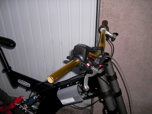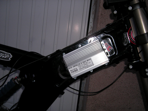 So--! nun zeige ich euch nicht das schnellste , aber ein ,( wie ich finde) sehr geiles Bike in seiner 1. Erstellungsphase! Das Bike hat natürlich ein Daumengas UND einen Tretsensor! Die ganze Kabellasche kommt in den Alurahmen wie man sieht. Forn ist schon die Hydraulische 4 Kolbenbremse von Gator angebracht. Der Controller mit 36 Volt 22 A ist auch schon an seinem Platz! Ein Schalter zum Einschalten des Controllers und des weiteren zum schalten der Leistungsbegrenzung auf 12 A ist auch schon am Lenker! Als Akku werde ich einen
