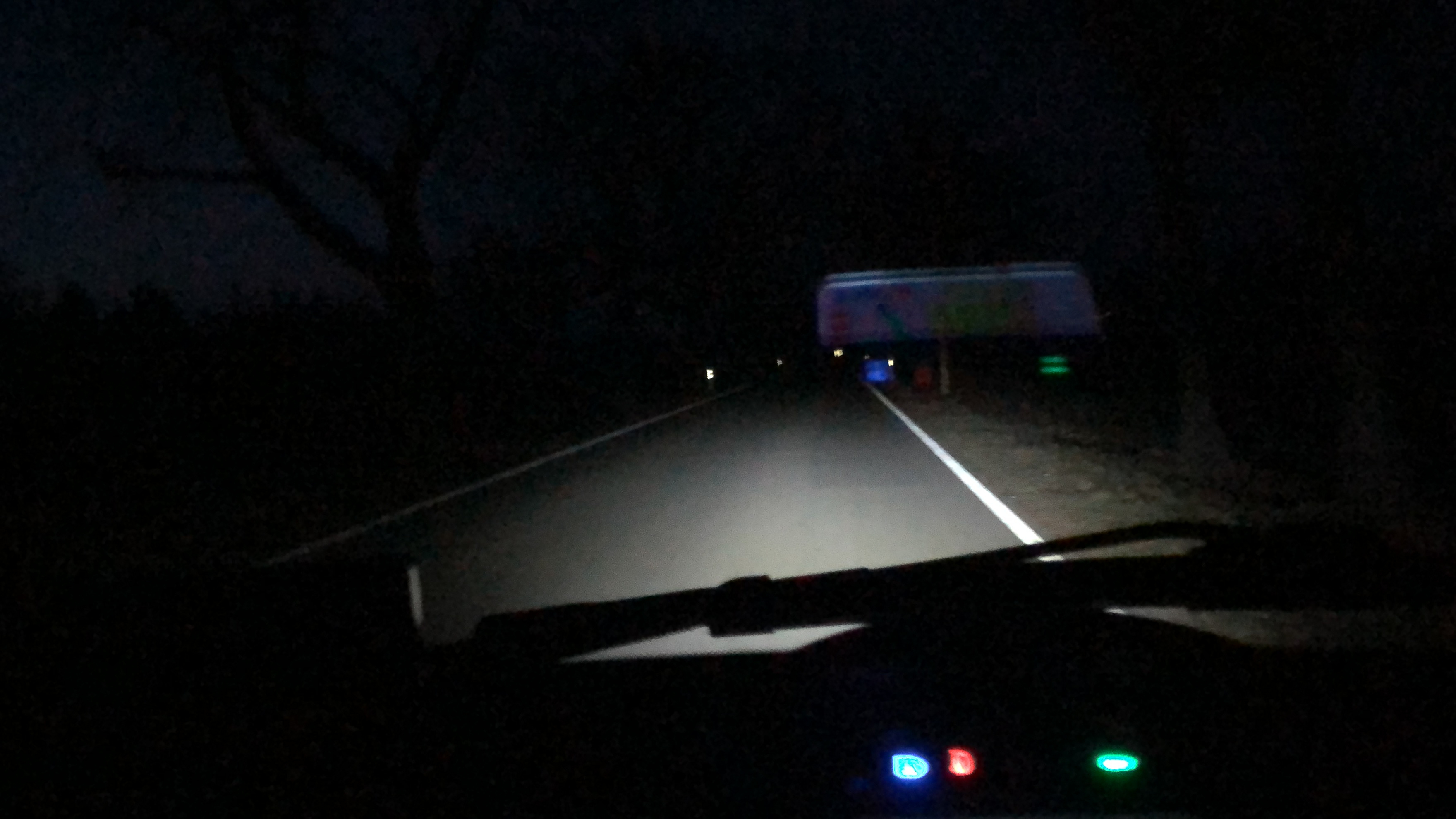 Hier mein Lichtkegel vom Fernlicht im Bild: Wenn keine Fahrstreifenbegrenzung reflektieren würde, wäre im Hintergrund überhaupt nichts zu sehen.