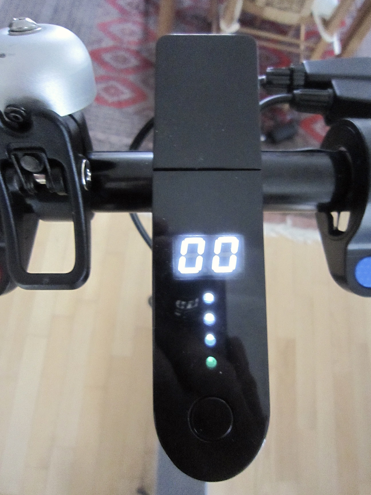 Die untere LED zeigt mit „grün“ an, das sie im Eco-Modus ist, damit ist die Geschwindigkeit auf 15km/h begrenzt. Mit einem „Doppelklick“ auf den Schaltknopf kann man zwischen „Eco“ und „Normal“ umschalten, dann fährt der Tretroller auch 20km/h.