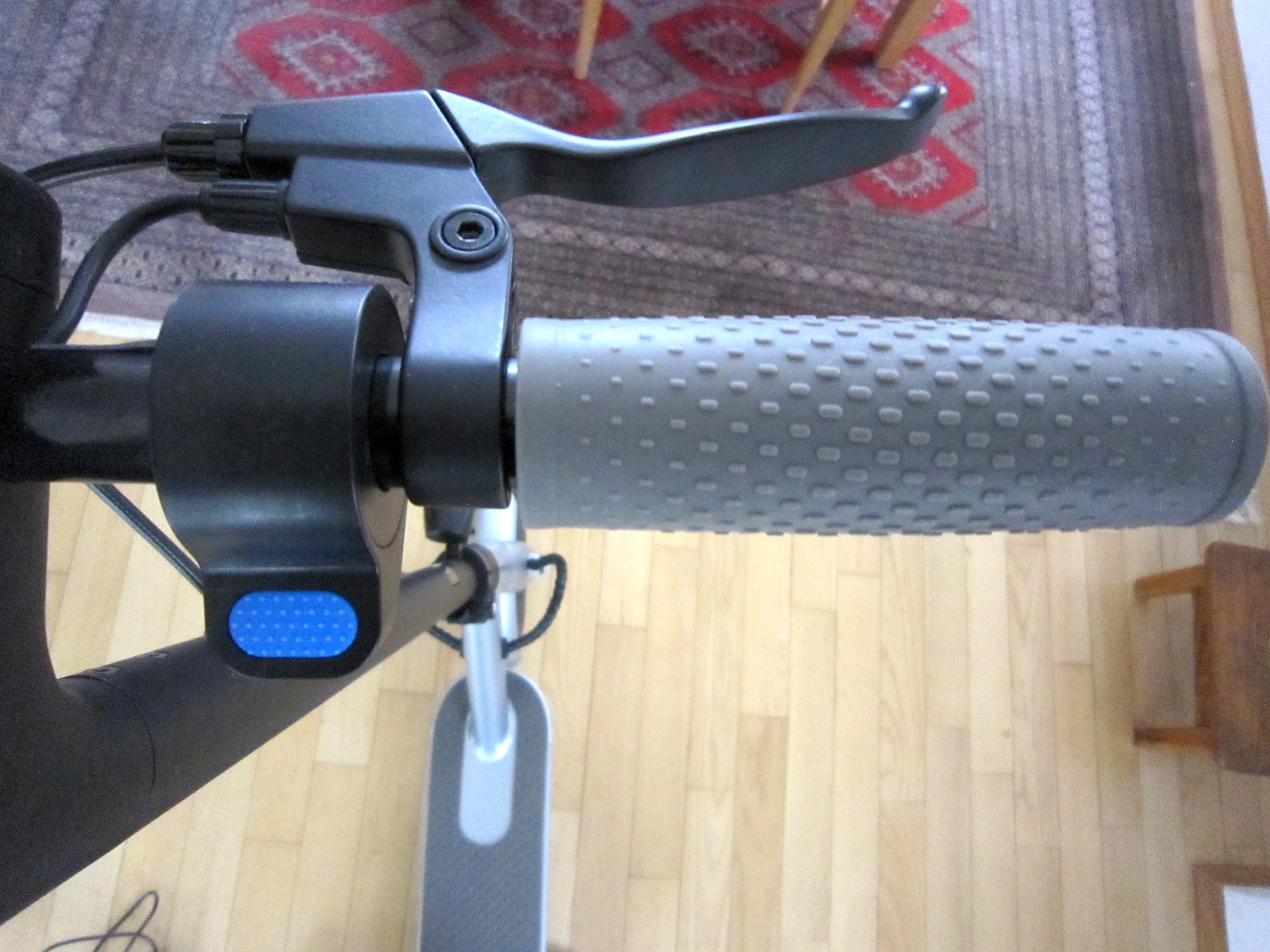Blau markiert ist das Daumengas. Es nimmt willig die Fahrt auf. Wie viele andere „Kickscooter“ muß man auch dieses Modell zunächst in Fahrt bringen (anschieben), im Stand nimmt der Motor keine Fahrt auf. Einmal anstoßen - wie beim einfachen „Kindertretroller“ sollte reichen, dann überneimmt der Elektromotor die weitere Beschleunigung.