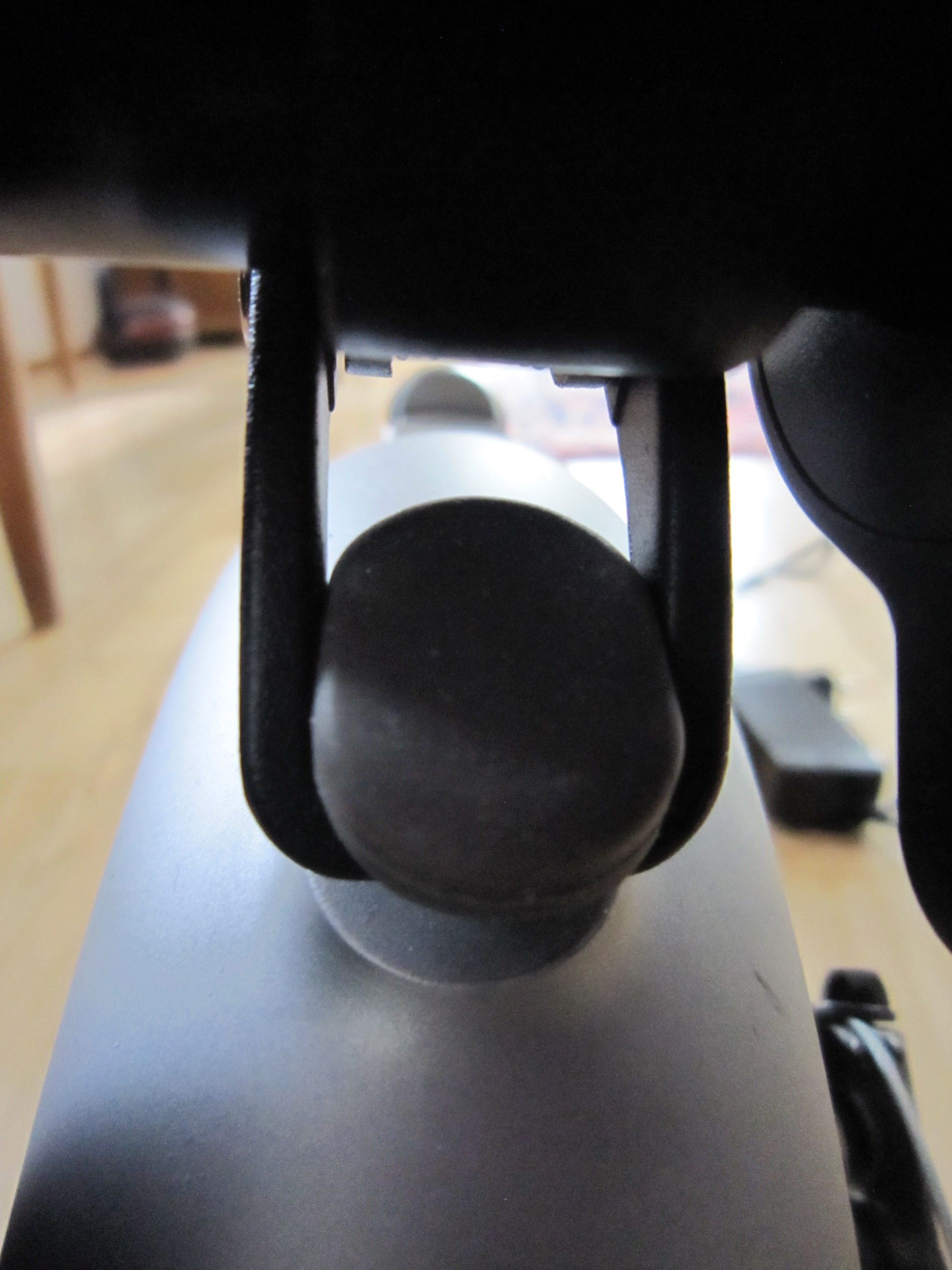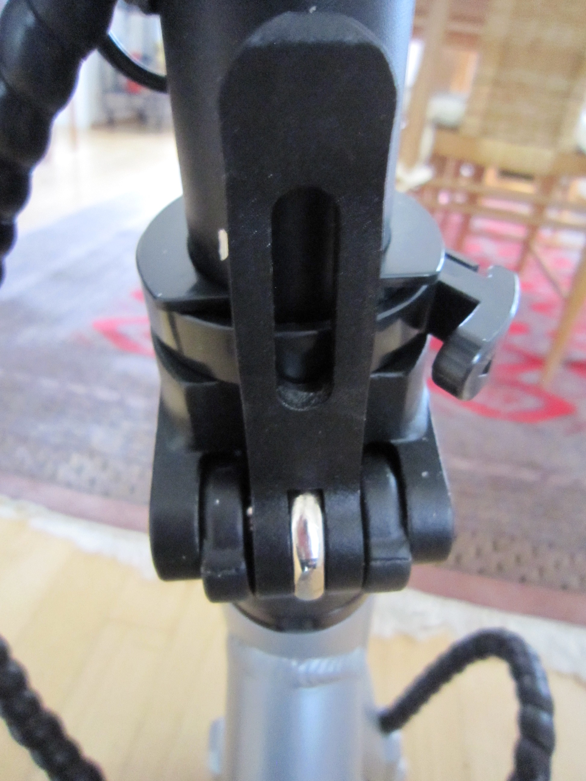 An der Vorderseite befindet sich ein Schnappverschluß der „einschnappt“ und duch den Hebel gesichert wird. Es gibt eine Schraube (Imbus bzw. 6 Innenkantschlüssel) um diese Schnappwirkung zu beeinflussen. Bei mir ist sie ausreichend von Werk eingestellt, ggf. muß man bei wackeliger Lenkstange hier nachregeln. Sollte alleine durch diese Maßnahme kein ruhiger Lenker möglich sein, kann man die mitgelieferten Butterflys (schwarze Weichgummischmetterlinge) nutzen. Diese liegen in einer eigenen Tüte der Bedienungsanleitung bei, werden dort aber nicht erwähnt. Sie haben unterschiedliche Dicken und können bei Bedarf unter dem Lenkstangenklickpunkt eingelegt werden um so einen wackeligen Lenker zu vermeiden (Vorsicht, beim einklappen der Lenkstange Verlustgefahr, sofern man sie nicht einklebt - was ich aber nicht empfehle).