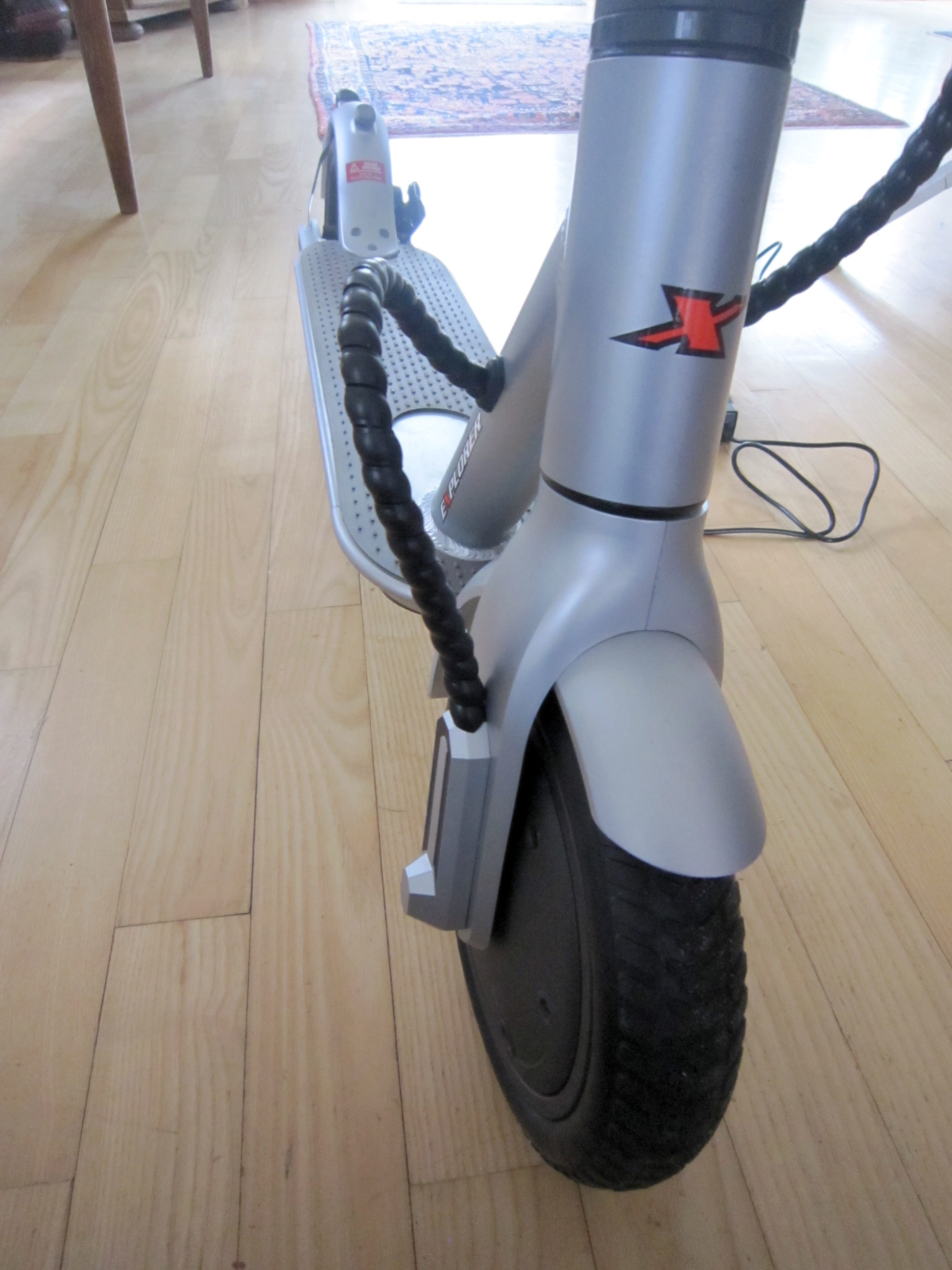 Im Vorderrad ist der 350W Nennleistung starke Radnabenmotor untergebracht. Der Reifen ist 8,5" groß und laut Bedienugngsanleitung mit Honeycomp Reifen ausgestattet. Das sind Reifen mit einer Bienenwabenähnlichen Struktur. Diese Kammern sind mit Luft gefüllt. Das heißt, man hat kein Ventil, in den man Luft einfüllen muß, wie bei Luftreifen mit Schlauch, aber einen besseren Federungskomfort als Vollgummireifen. Es ist eine gute Kompromißlösung, da man bei einem eingefahrenen Nagel, Splitter oder ähnlichem normalerweise noch weiter fahren kann, wenn man das Objekt aus den Reifen entfernt und nicht gleich reparieren muß, wie beim Luftreifen und hat doch eine bessere Federung als bei einem Vollgummireifen. Leider kann man aber nicht mit den Luftdruck experimentieren (etwas mehr um bessere Laufleistung zu erreichen oder etwas weniger um besseren Federungskomfort zu erhalten), weil die Luftkammern vergossen sind. Die Zuleitung der Verkabelung kommt vom Motorcontroller, der mit im Akkufach unter dem Trittbrett angebracht ist. Man sieht die schwarz ummantelte Zuleitung vom Trittbrett zur Radnabe (in Fahrtrichtung rechte Radseite).