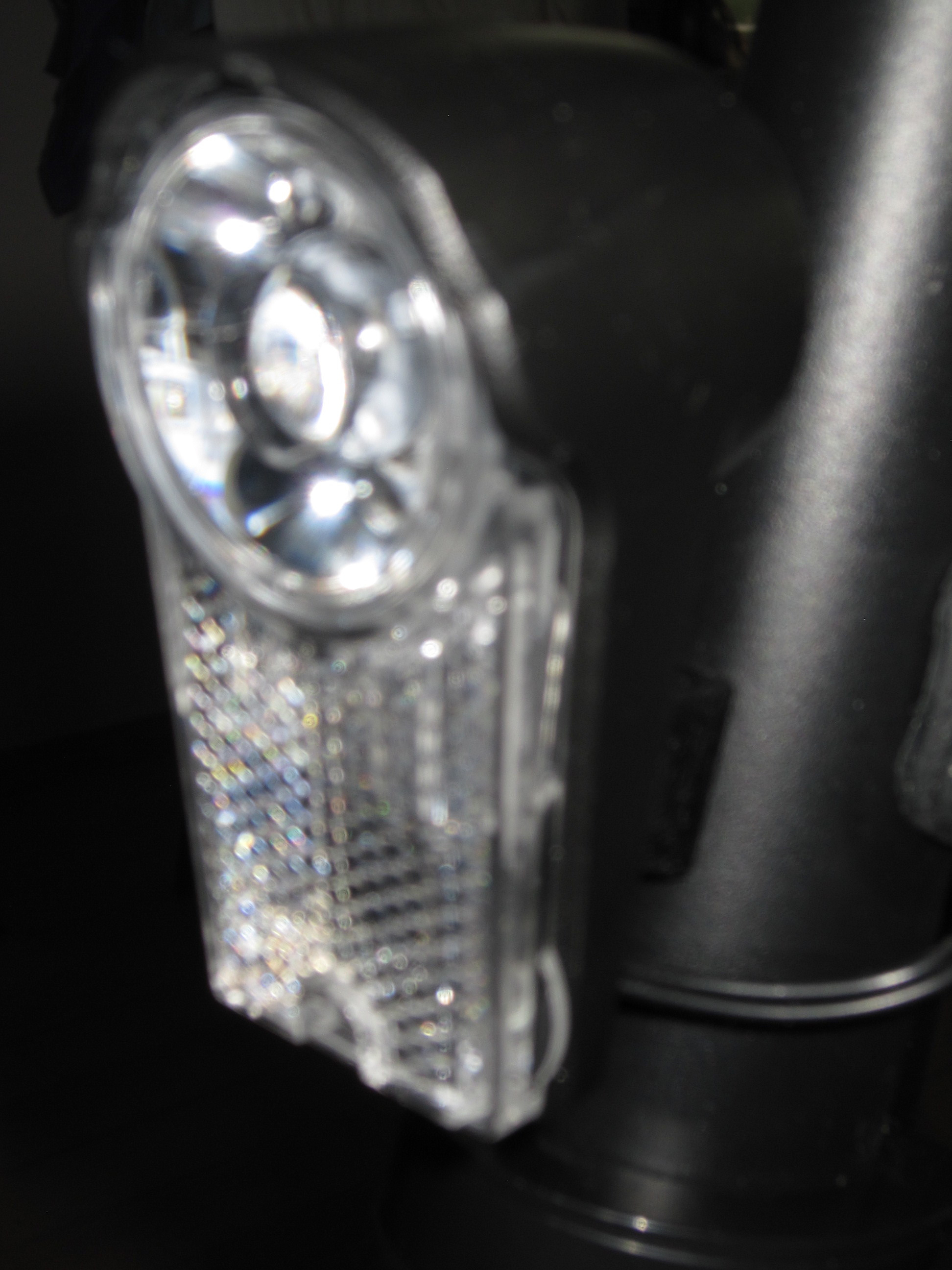 Das weiße Vorderlicht ist mit den vorgeschriebenen weißen Reflektor kombiniert. Es handelt sich, wie das Rücklicht (rot) um LEDs. Der Frontscheinwerfer sollte nach dem Auspacken und ersten einschalten justiert werden, dazu kann man ihn an einer Schraube um deren Achse drehen. Bei mir war sie viel zu hoch eingestellt und hätte den Gegenverkehr geblendet.