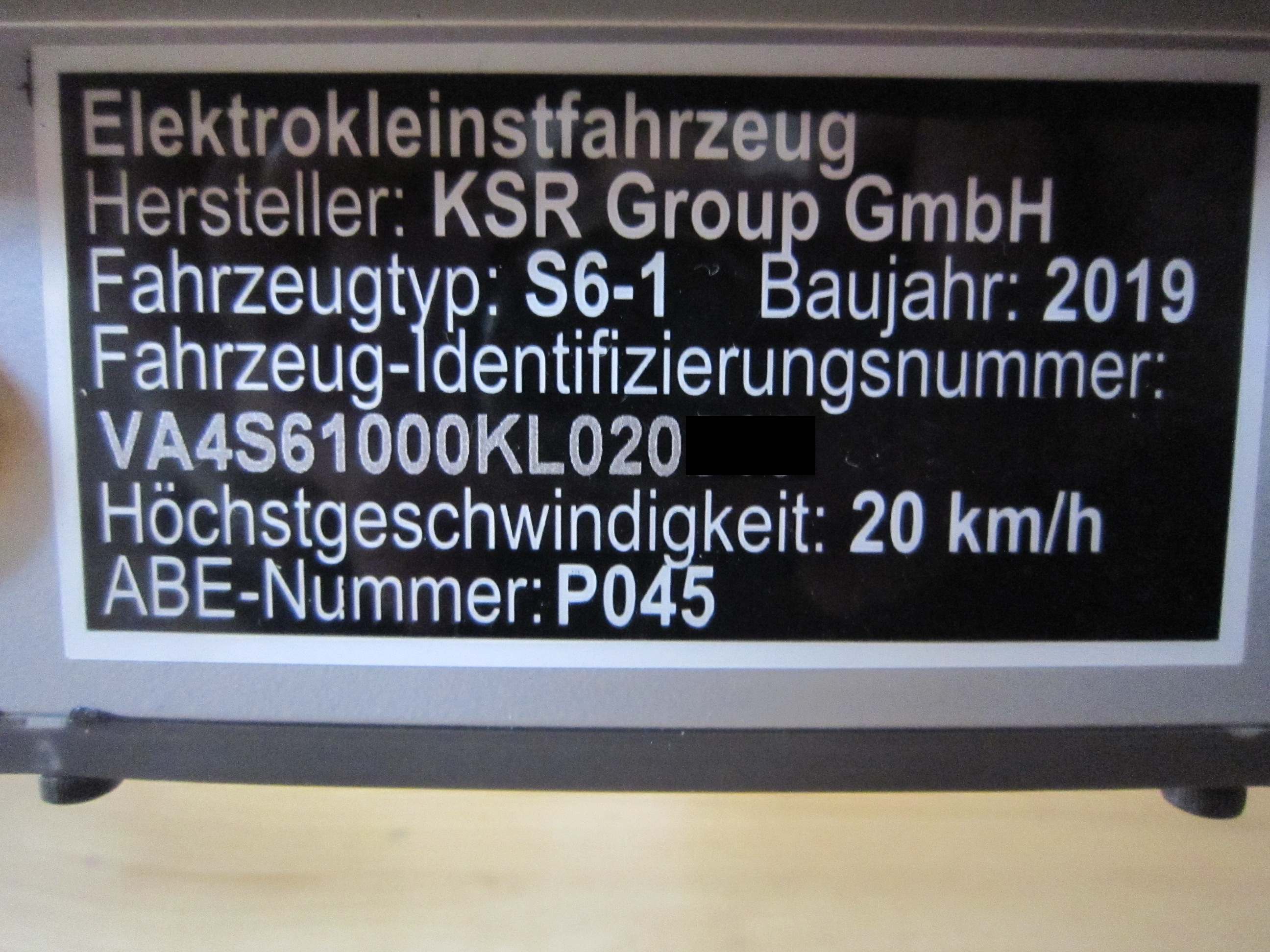 Das Typenschild (in Fahtrichtung rechts, mittig unter dem Trittbrett), was die Fahrzeugsklassifizierung, die Zulassung (ABE = Allgemeine Betriebserlaubnis), den Hersteller bzw. verantwortliche Importeur, die Seriennummer und weitere Einträge erhält. Viele Punkte kann man der Typengenehmigung beim Kraftfahrbundesamt (KBA) entnehmen, wo alle Elektrokleinstfahrzeuge die in Deutschland am Straßenverkehr teilnehmen dürfen, gelistet sind (siehe verlinkten Thread in diesem Forum).