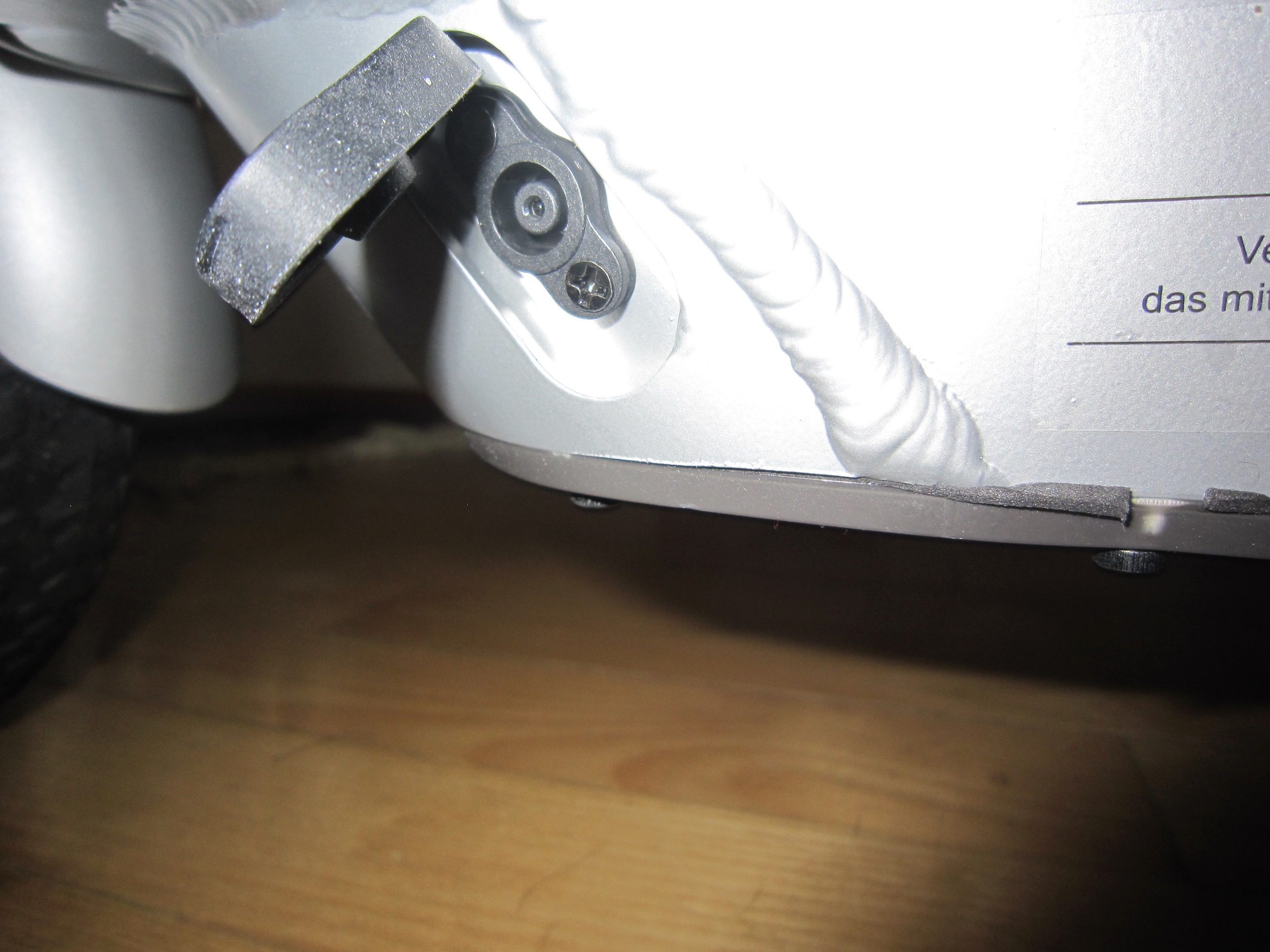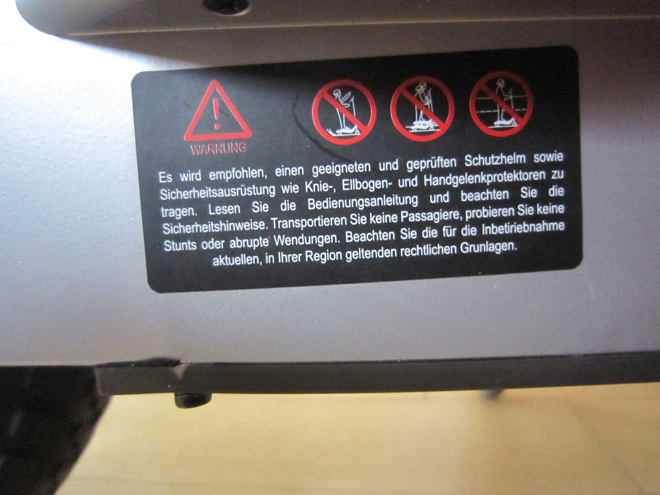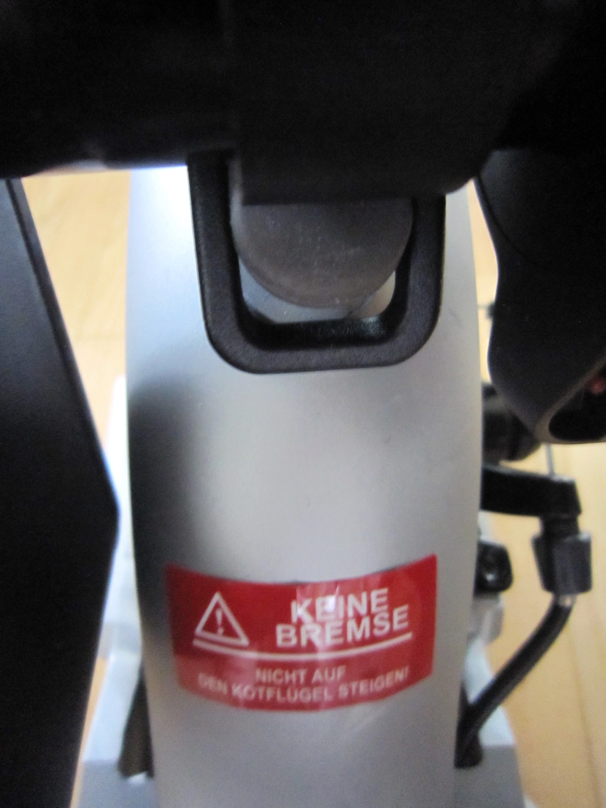 Der letzte Warnaufkleber ist auf der Rückradabdeckung aufgeklebt und soll den unkundigen Nutzer davor warnen, das das Hinterrad keine Rücktrittbremse ist, es also nicht förderlich ist, auf die Hinterradabdeckung zu treten.