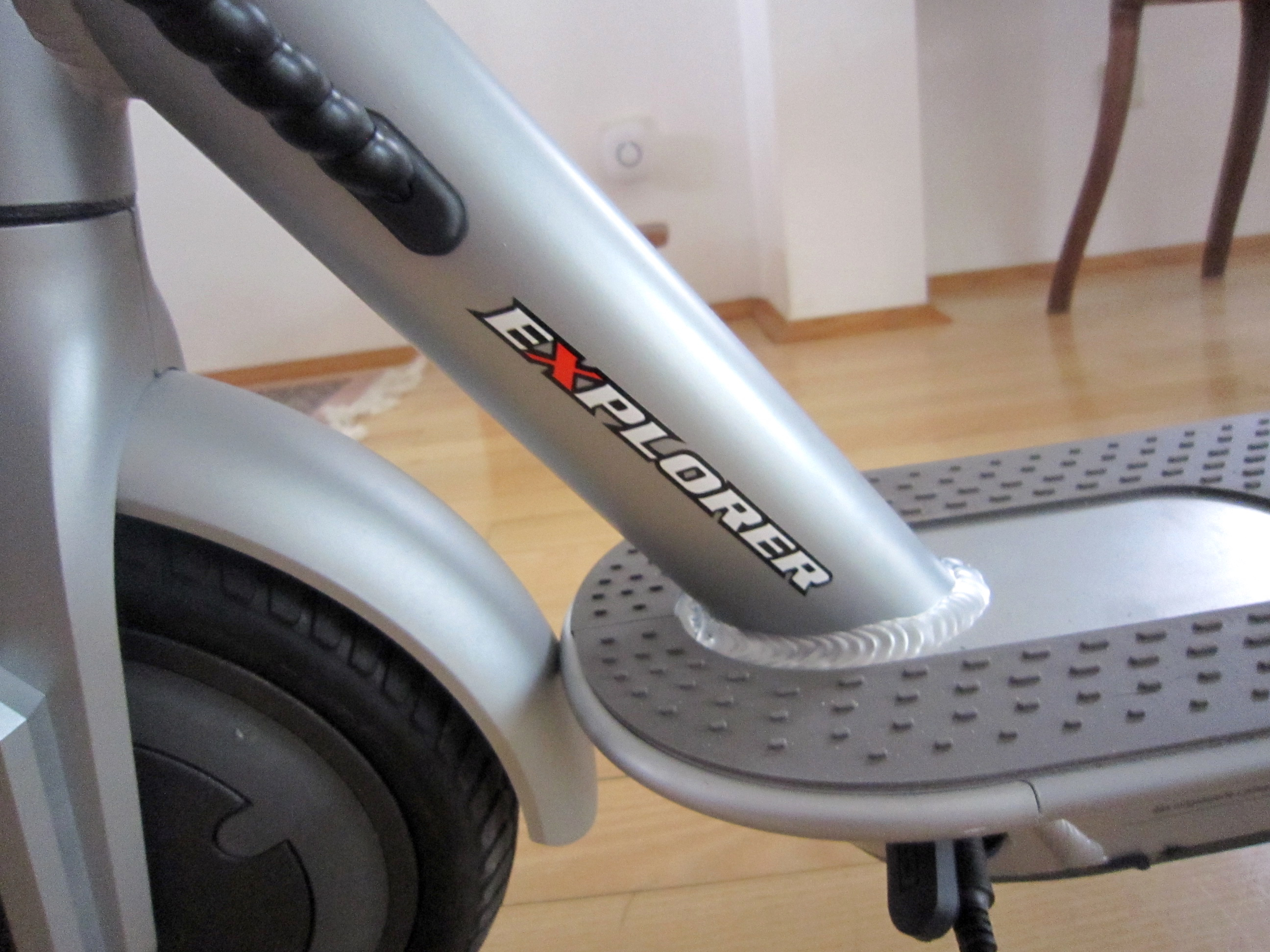 Zur Zierde sind noch Aufkleber angebracht (vorne auch seitlich) das es sich um ein Explorermodell handelt (rotes X vorne Lenkstange , bzw. Schriftzug seitlich, Querstrebe):