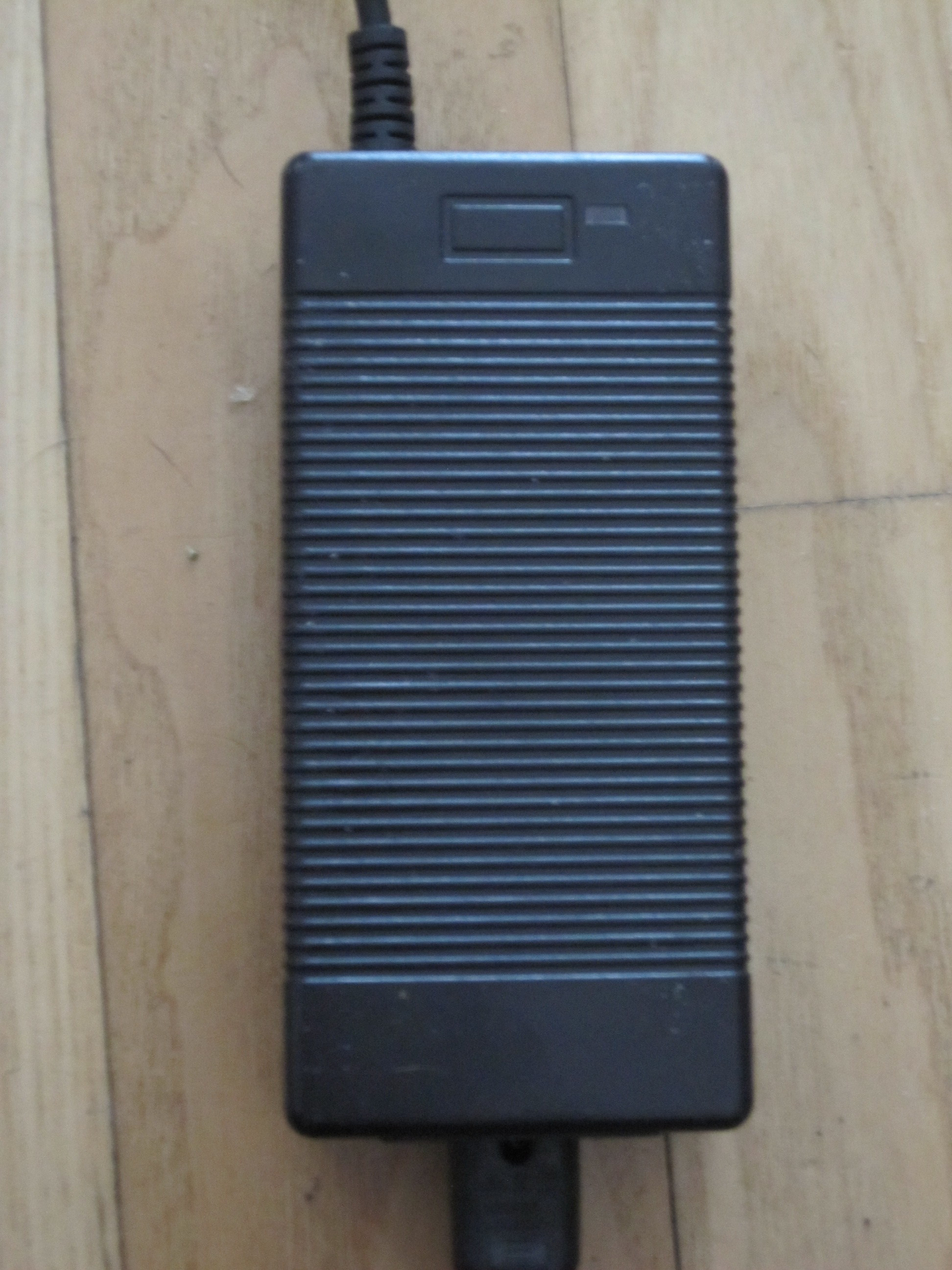 Das Ladegerät kommt mit zwei Aufklebern auf der Rückseite und einer grade, geriffelen Vorderseite, wo ein Rechteck, der bei anderer Nutzung ein ein Schalter sein könnte und einer zweifarben LED auf der Vorderseite. Es ist etwa Handgroß (OK, ich habe nicht sonderlich große Hände, halte das aber für eine akzeptablen Vergleich) ohne Daumen. Es verfügt über ein Euroflachstecker auf ein „Rasierapperatanschluß“, der Einsteckbar und somit auswechselbar ist. Die Sekundärseite (die Ladezuleitung zum Akku) ist fest am Ladegerät angebracht und ca. 1m lang. Auf der Ladeseite ist ein RCA-Rundstecker (kennt man mit kleineren Durchmesser und vorstehenden Innenpol vielleicht noch von der Stereoanlage, da nennt sich diese Stecker Chinchstecker). Das Ladegerät hat eine Ladeleistung von 42V, 1,5A = 63W. Primär soll es maximal 2A ziehen, was auf einen schrecklich ineffektiven Leistungsgrad schließen läßt.