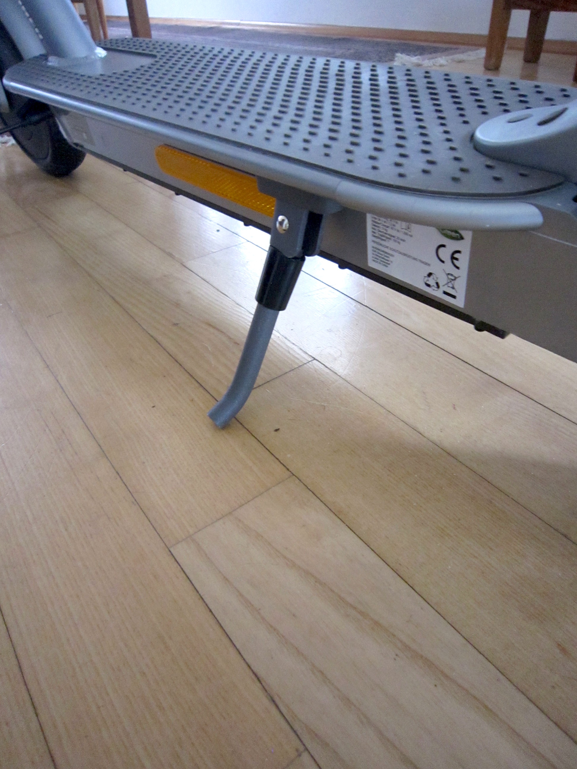 Hier noch ein Bild von der linken Seite, mit den Ständer (mit Kunststoffmanschette oben) und der gummierten Auflage mit länglichen Riffelung, farblich passend zu der Allueloxierung und den Handgriffen. Man kann auch die länglich gelben Reflektoren sehen.
