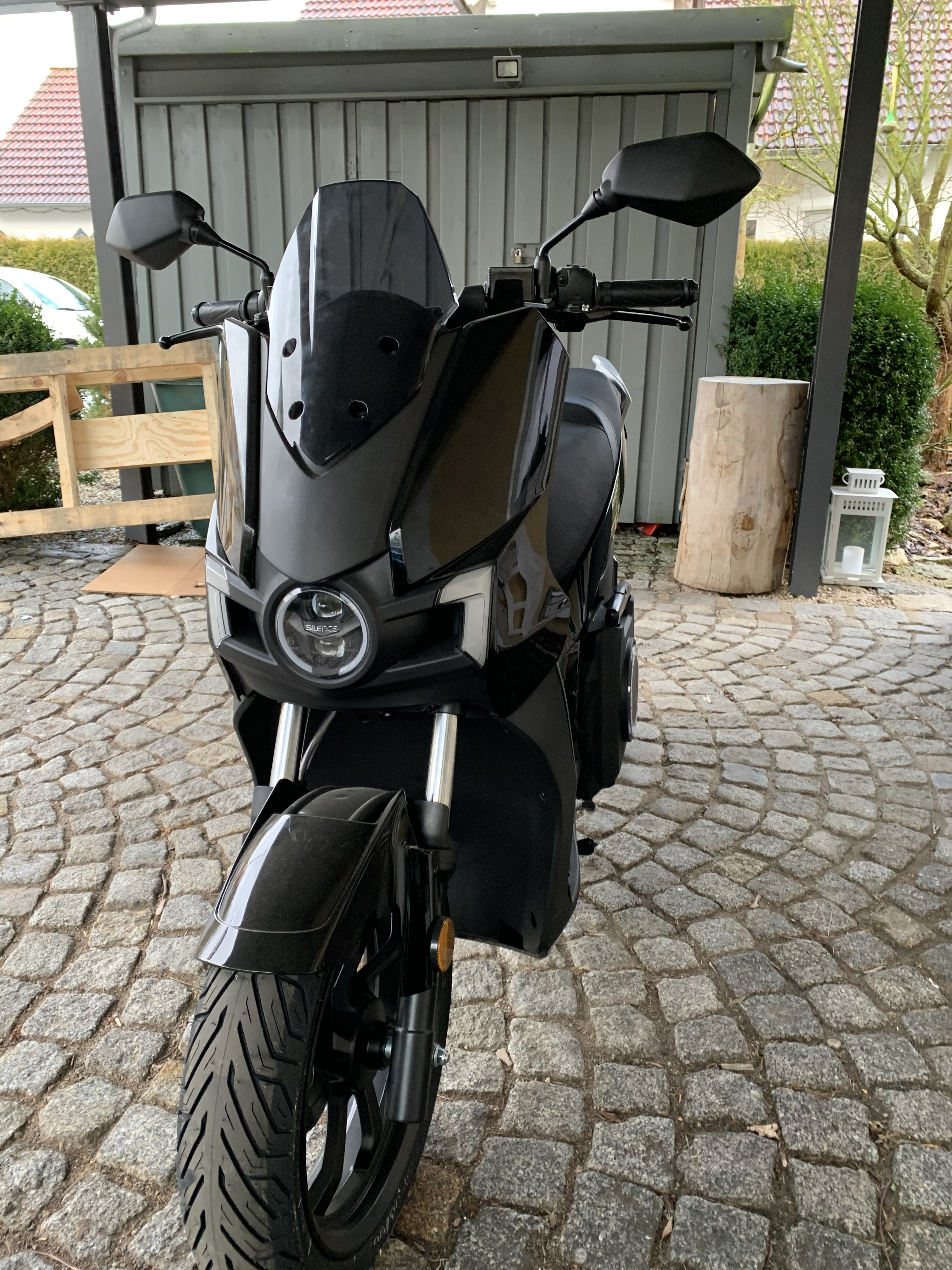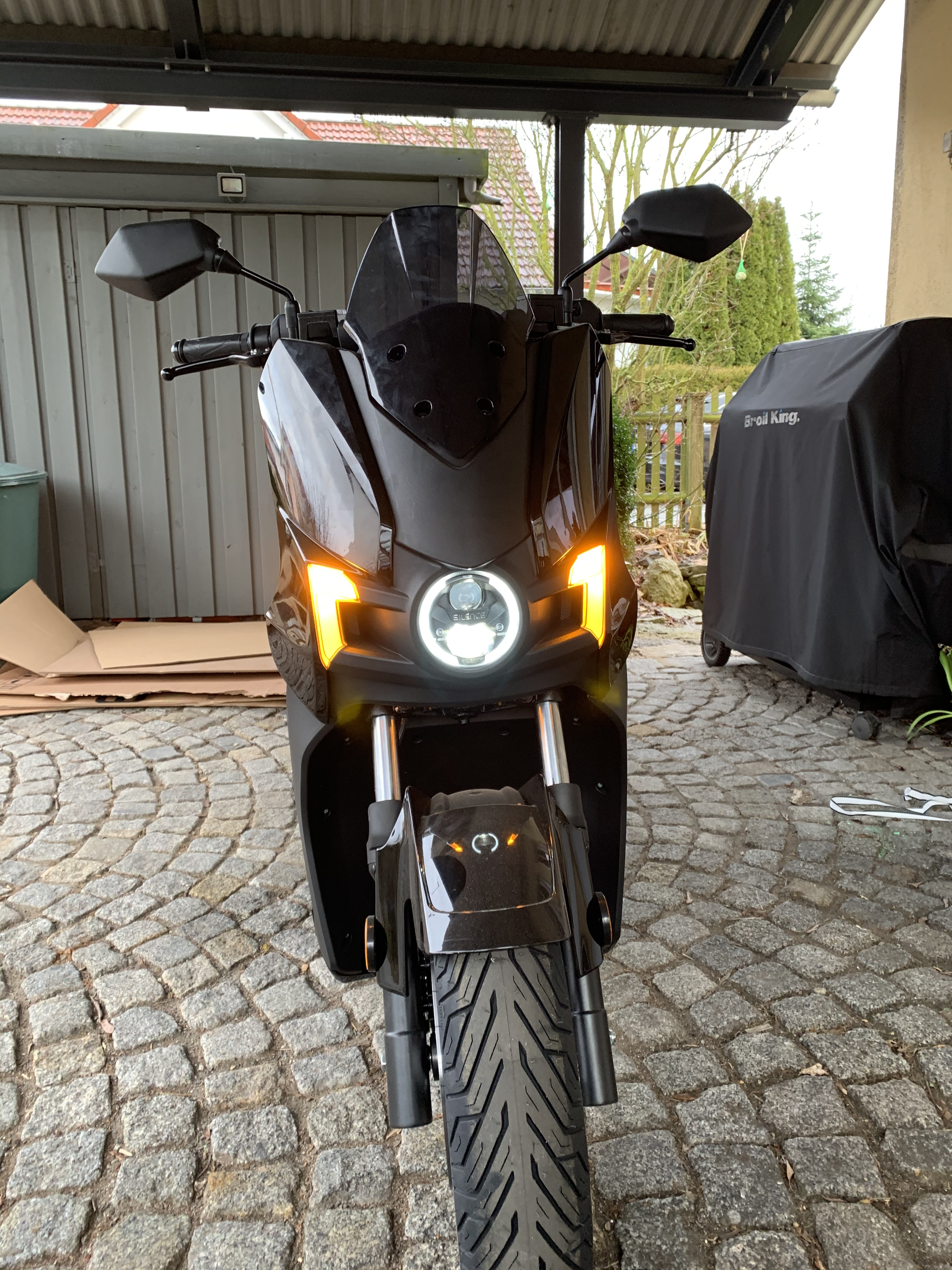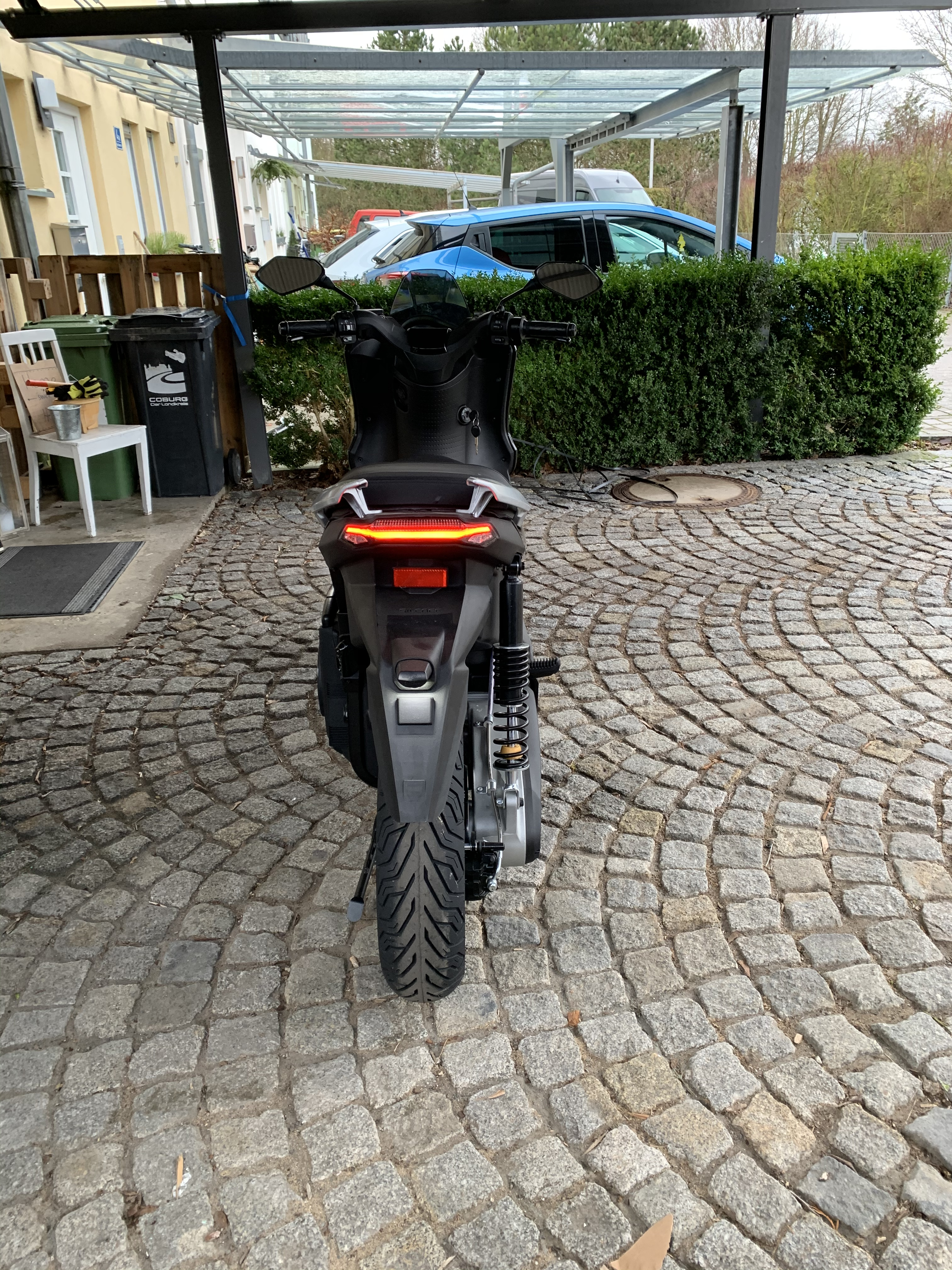 müsste passen, weil die Spiegel über die Lenker-enden raus-stehen. Der Roller wirkt schon richtig massiv, da fallen die Spiegel schon ein bisschen auf.