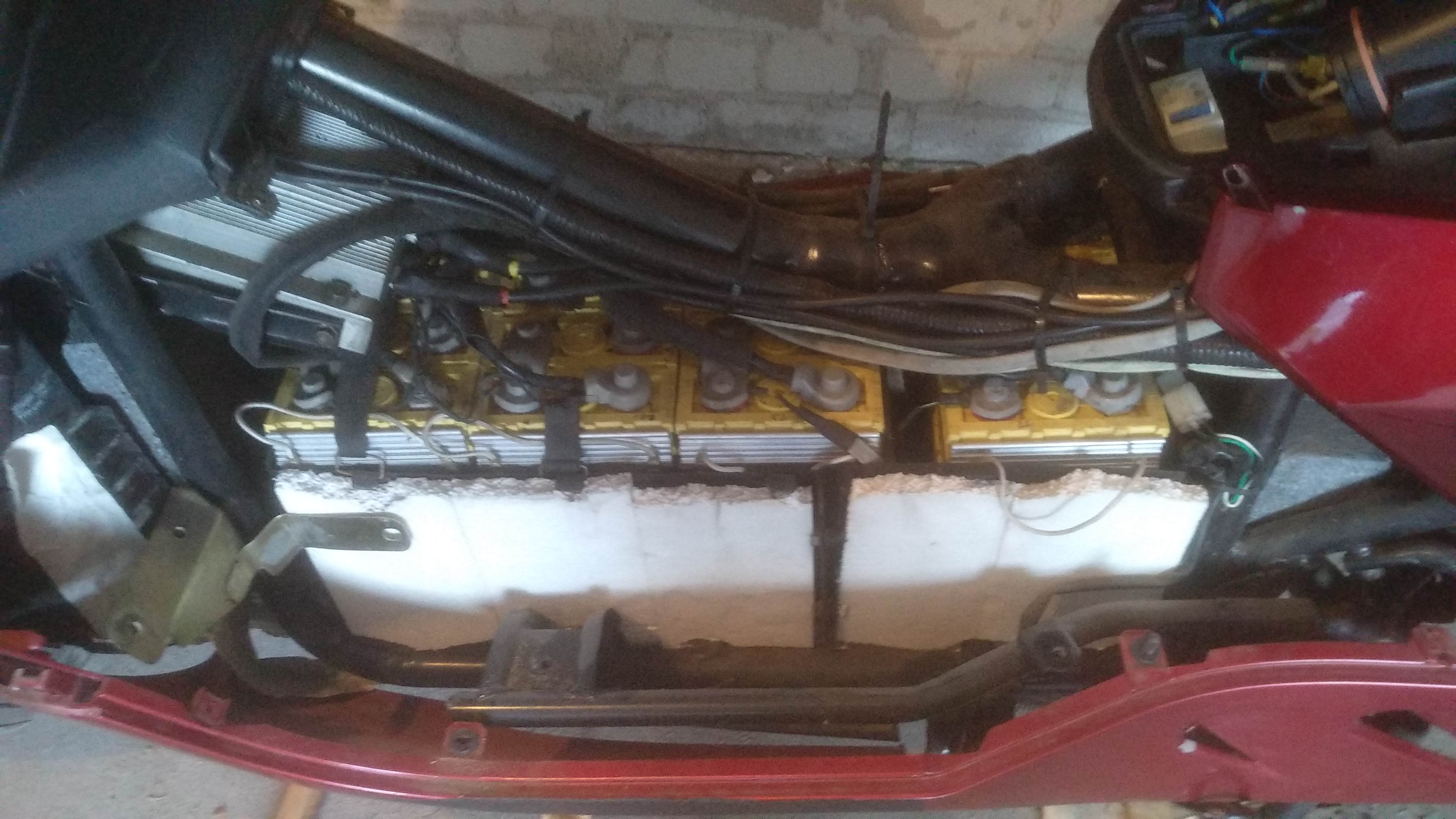 Zugang zum Einschieben der Akkus in die Akku-Kiste (die natürlich nur in Elektrorollern in diesem Rahmen steckt) hat man im Bereich unter der Sitzbank. Es muss also Sitzbank und die Helm/Fracht-Box herausmontiert werden. Um Arbeiten und die Verkabellung herstellen zu können, sollte auch die Verkleidung innen im Beinraum ab. Vorne (also alles was vor den Knieen des Fahrers ist) kann dran bleiben, wobei man bei unklarer Erkenntnis wo welche Schraube den genau steckt oft zuviel demontiert (also am Sitz anfangen). Auch bei anderen und kleineren Rollern liegt der zugang unter dem Sitz. Vielleicht sieht es bei Deinem auch so aus: