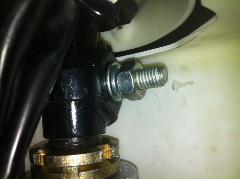 so, gute nachrichten hab ich. geräusch ist jetzt weg. das spiel in der lenkkopfgeschichte ist jetzt weggeschraubt worden. grade so fest angezogen dass das vorderrad sich noch einigermassen gut bewegen lässt und das spiel weg ist. man kann auf dem einen bild auch gut sehen dass durch das spiel an der lenkkopfstange unten auch schon etwas abgeschliffen worden ist.