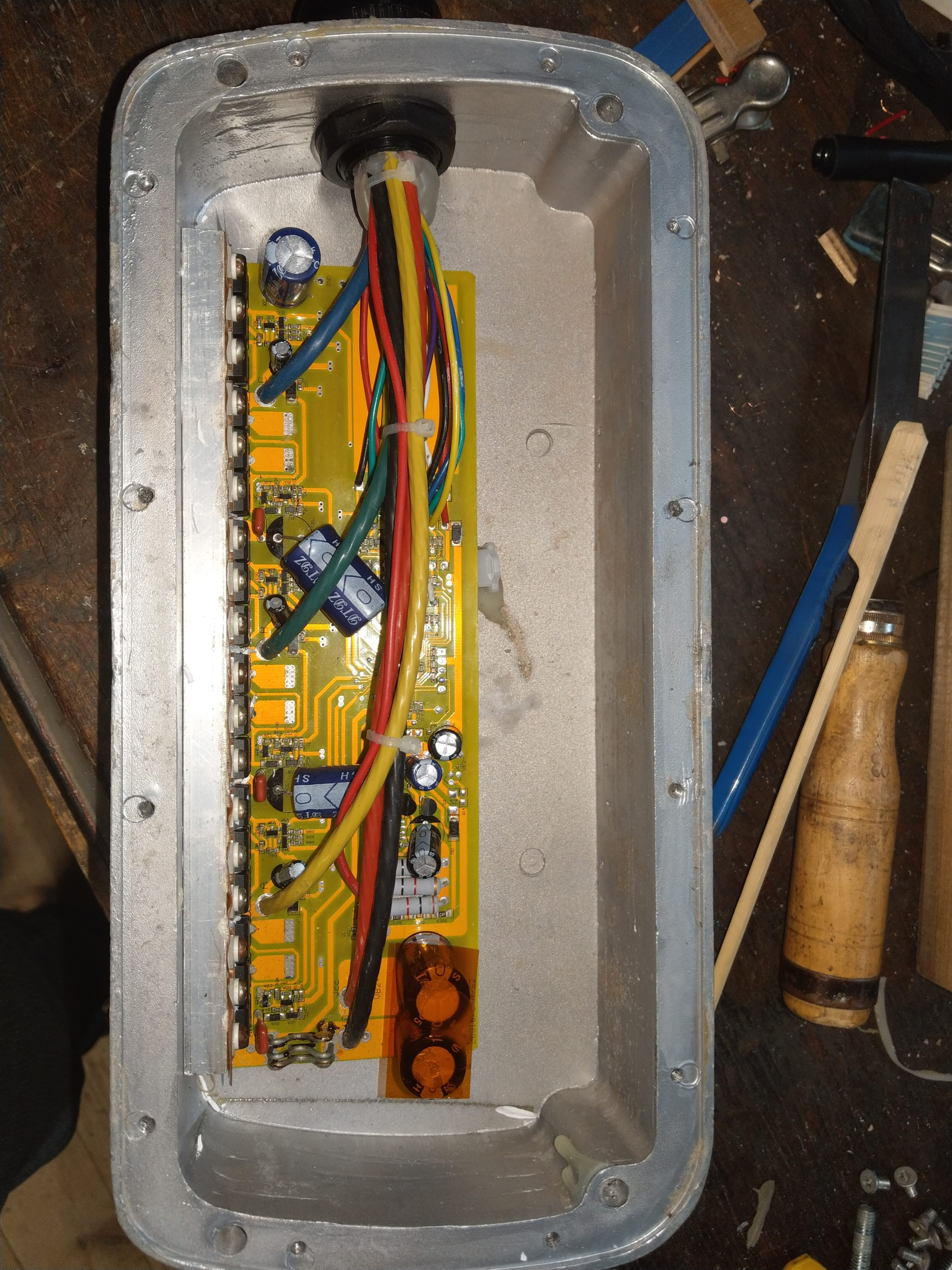 Der Controller (Massives Alugussteil) hat eine Platine EB818 mit einem Infineon IC BC846 und 18 Stk Fets P75NF75