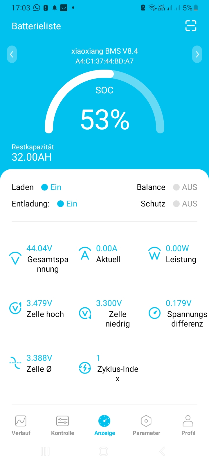 Zusätzlich fällt mir auf, dass in deiner App-Anzeige die Spannungslage nicht zu den Prozenten passt: 50% Restladung hast du vielleicht bei 48V, nicht bei 44 oder 45. Die Kapazität ist in deiner App anscheinend nicht richtig eingestellt bzw. der Akku erreicht die angegebene Kapazität nicht (was bei Chinaakkus eher die Regel als die Ausnahme ist).