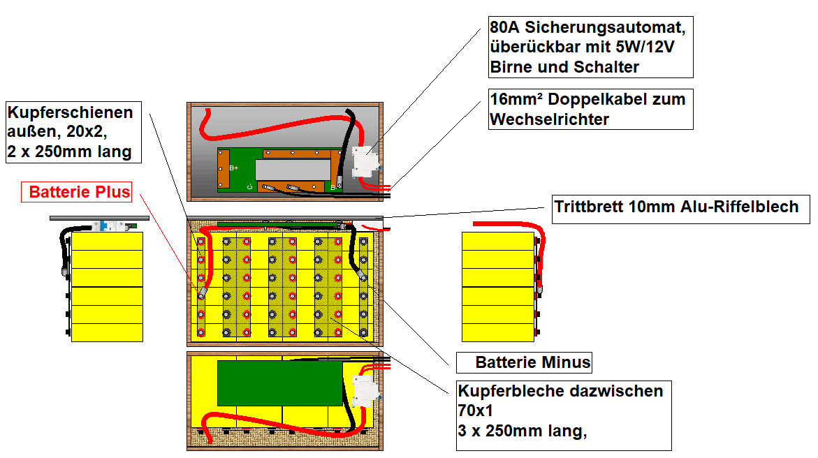 Ein erster Entwurf sah daher vor, die 24-zellige 4s6p Batterie mit hochkant liegenden Zellen auszuführen, auf Regalbrettern gestapelt. Parallelschaltung in Querrichtung mittels je 2 Anreihungen von 20x3 mm Cu ETP Stromschienen, Reihenschaltung von oben minus bis unten plus mittig über kurze 25x3 Cu ETP Stromschienen: Das haben wir dann bis zur Version 3.1 weiter optimiert, indem wir die Reglabretter abschafften, mit jeweils 4 Zellreihen direkt aufeinader gestapelt. Zum Kupfer sparen die Zellen ganz rechts gespiegelt eingebaut, und die Reihenschaltung durch gemeinsame 70x1 Kupferschienen zu realisieren, und die Batterie Minus- und Plusschiene auf 20x2mm abzuspecken: Doch es war uns klar, dass dies eine denkbar ungünstige Gestaltung mit enormem Kupferverbrauch war. Außerdem wollte mein Kumpel diese Lücke zwischen Aufbau und Fahrerhaus lieber für einen Frischwasser-Zusatztank nutzen.