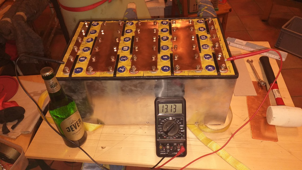 Jetzt sind die Zellen in meiner originalen Reihenfolge (ich hatte sie dem Alter/Seriennummer nach sortiert, 1 die erste, 24 die neueste, alle innerhalb etwa eines Monats) eingebaut, mittels Kabelbinder verzurrt, und mit den Stromschienen verbunden. Mit 13,13V sehr nah am 13,2V Zielwert dran, bei ca. 60% Ladestand