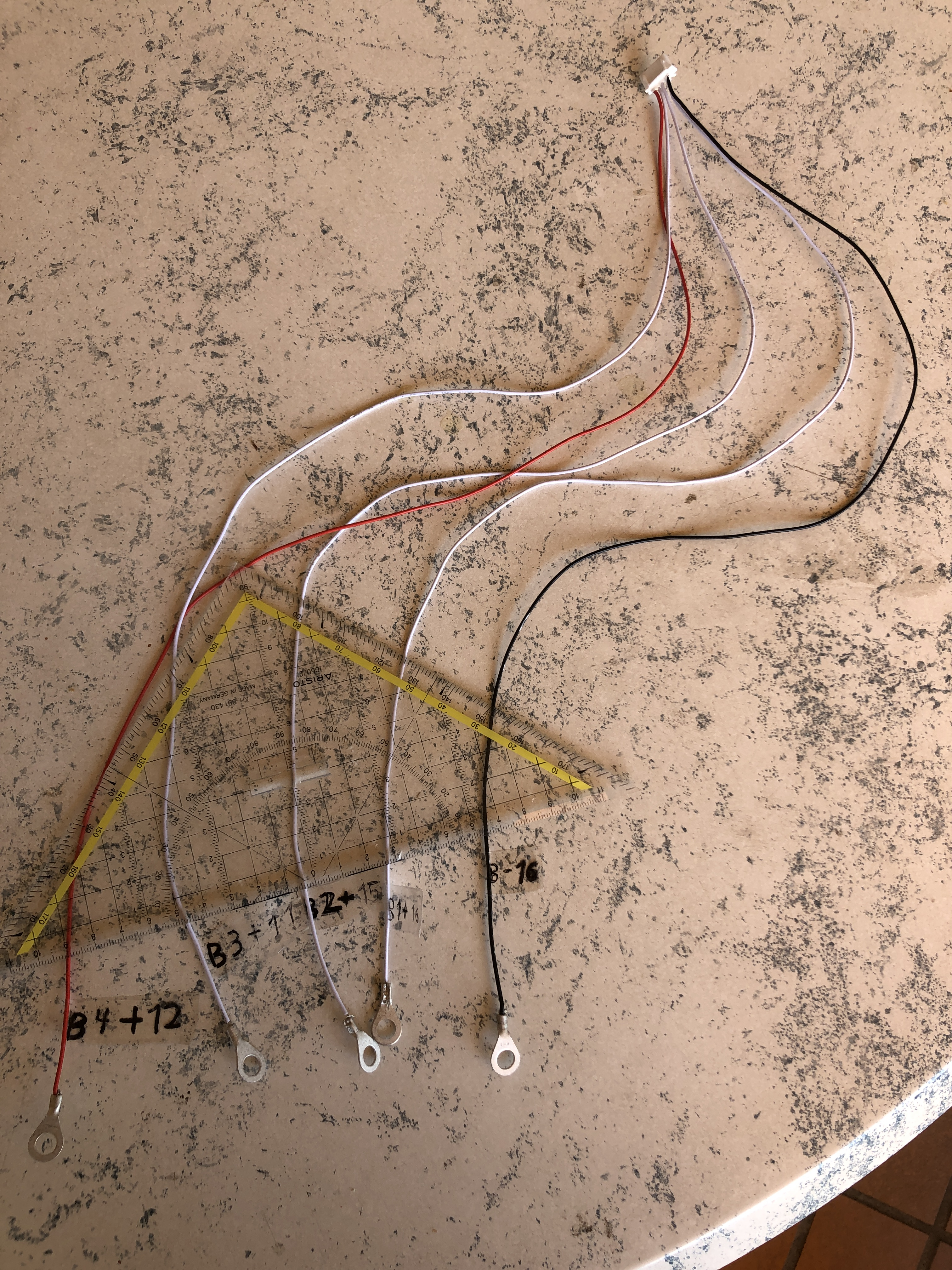 Heute habe ich den BMS Kabelbaum mit 5 Stück M6 Ringkabelschuhen verkrimpt und ganz eindeutig entsprechend Zellennummer und Polung beschriftet, und mehrfach von mir durchgepiept und auf Richtigkeit kontrolliert: