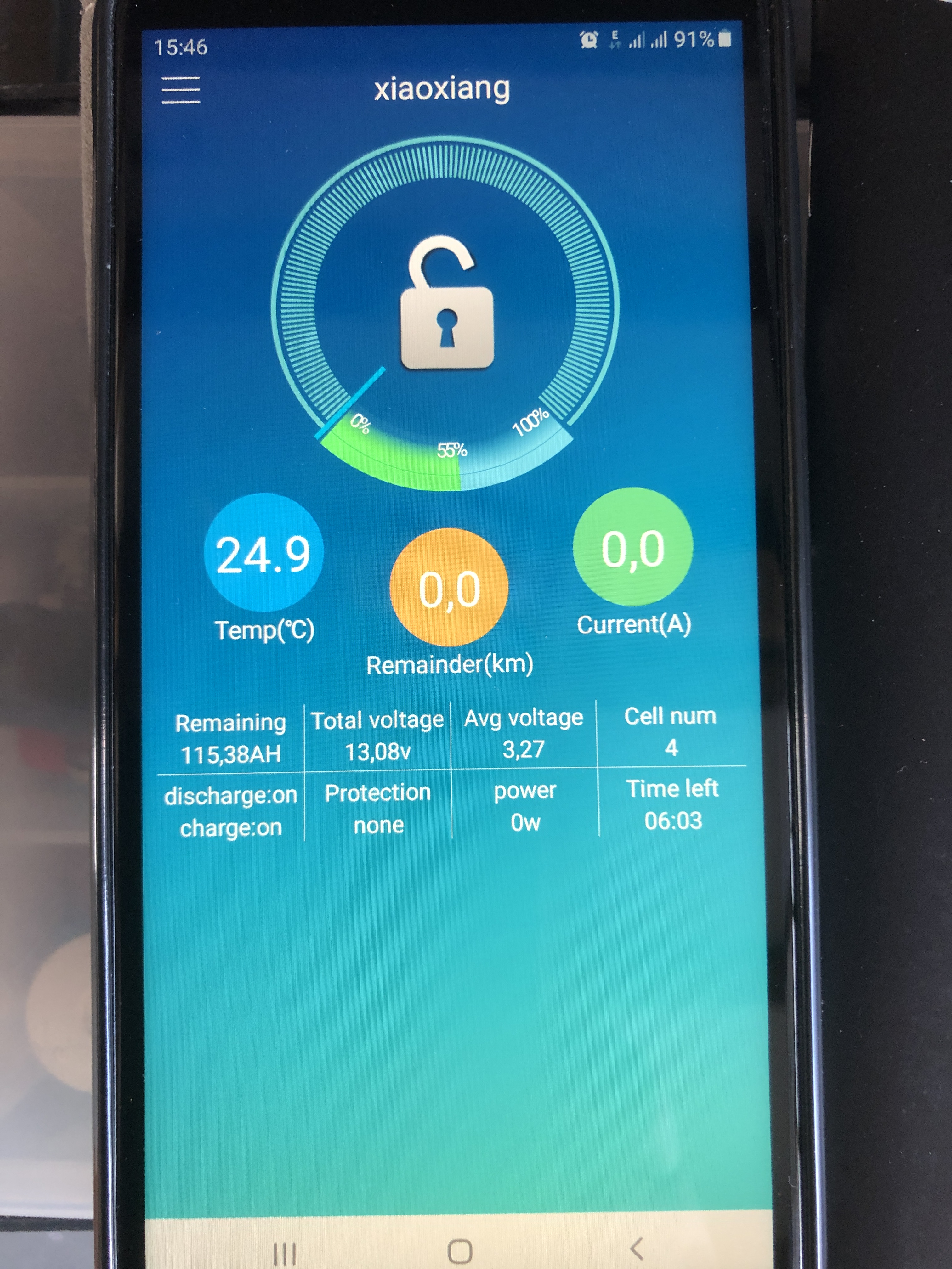 Hier die App-Anzeige, endlich mit einer echten Batterie konfrontiert: Batterie- und Zellspannung passt, die Füllstandsschätzung ohne Last, rein aufgrund des von mir eingegebenen sehr flachen Entladespannungsverlaufs der Winston Zellen, trifft den ca. 60%igen Ladestand recht gut. Die Primästromanzeige der App stimmte erstaunlich genau mit der Strommesszange überein, die Spannungen mit meinem Multimeter. Seitens BMS also alles i.O.