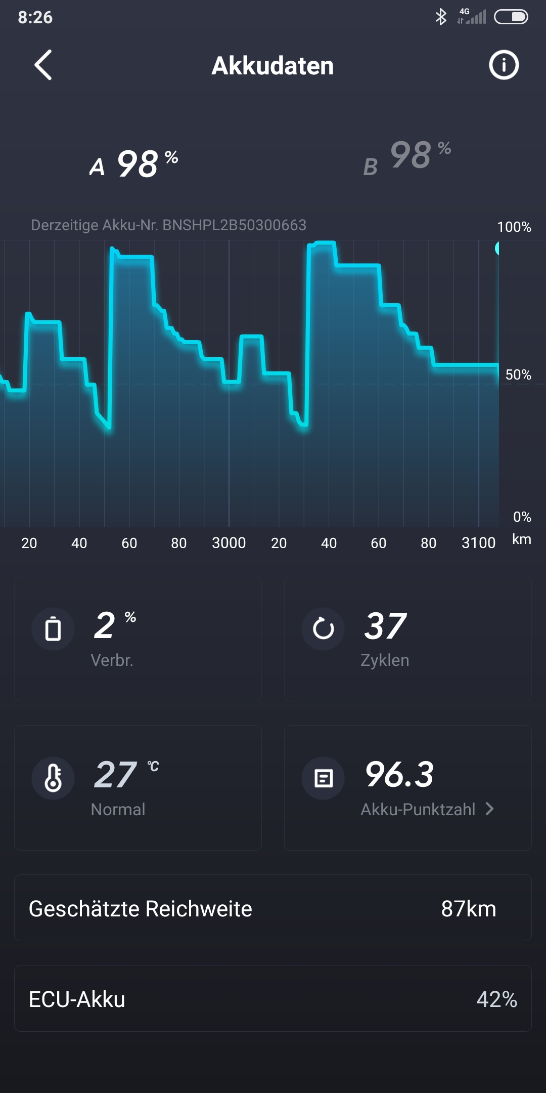 Es wundert mich nur, dass die Anzeige am Rollerdisplay selber vollkommen stimmig ist. Bin gestern stolze 86km gefahren und der Verbrauch lag bei exakt 85% und es gab nie seltsame Anzeigen am Display. Nur die App spinnt.