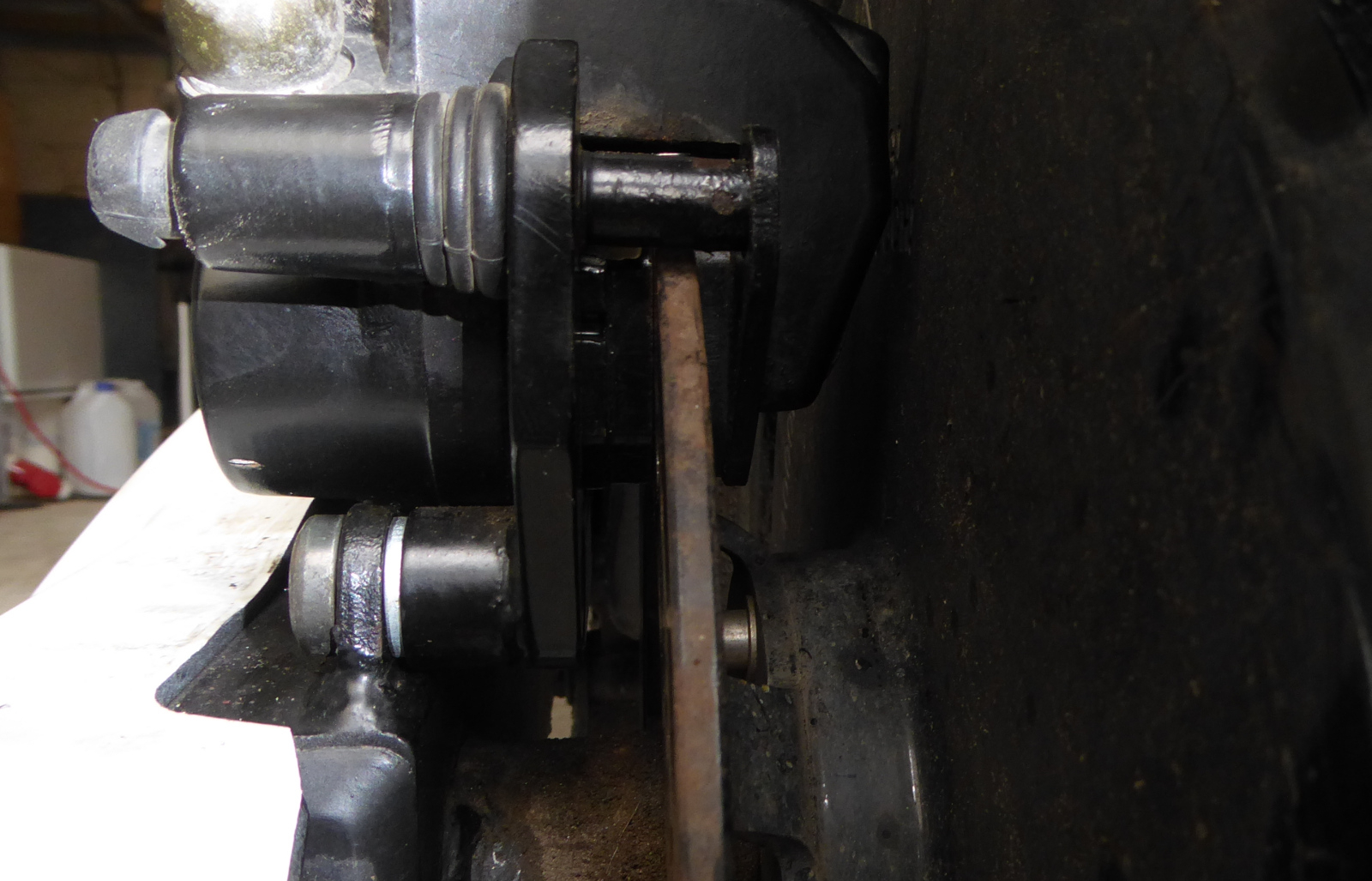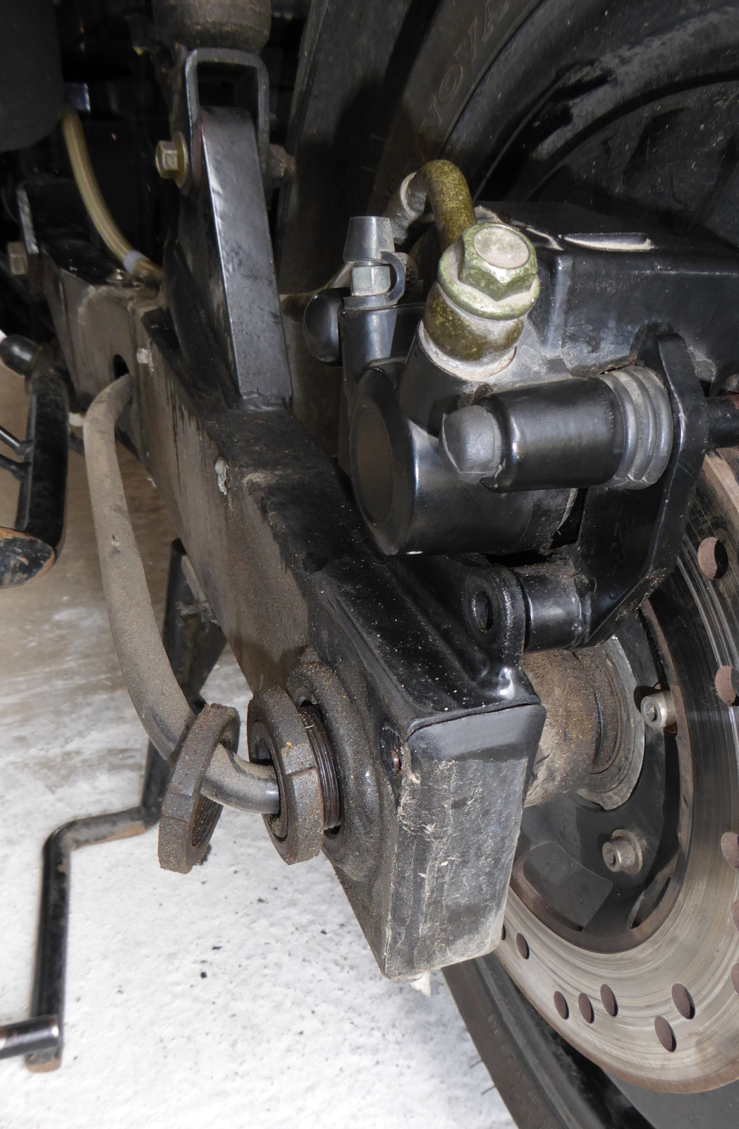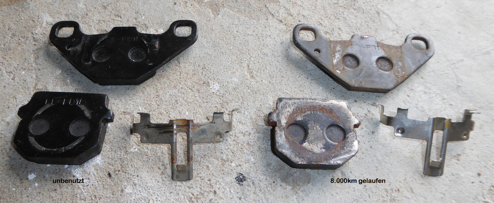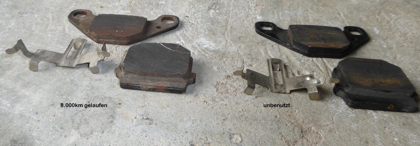 Also wieder aufgebockt und nachgeschaut und da hing der äußere kleinere Bremsklotz nach unten aus dem Sattel?!?