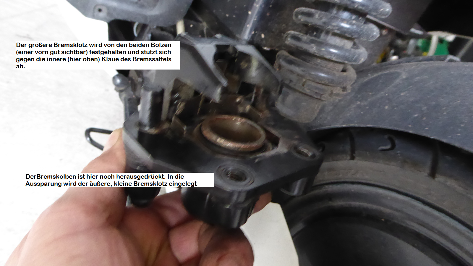Der innere Blemsklotz wird durch zwei Bolzen gehalten /geführt - aber der äußere, kleine Bremsklotz ist nur in eine Art Aussparung eingelegt?