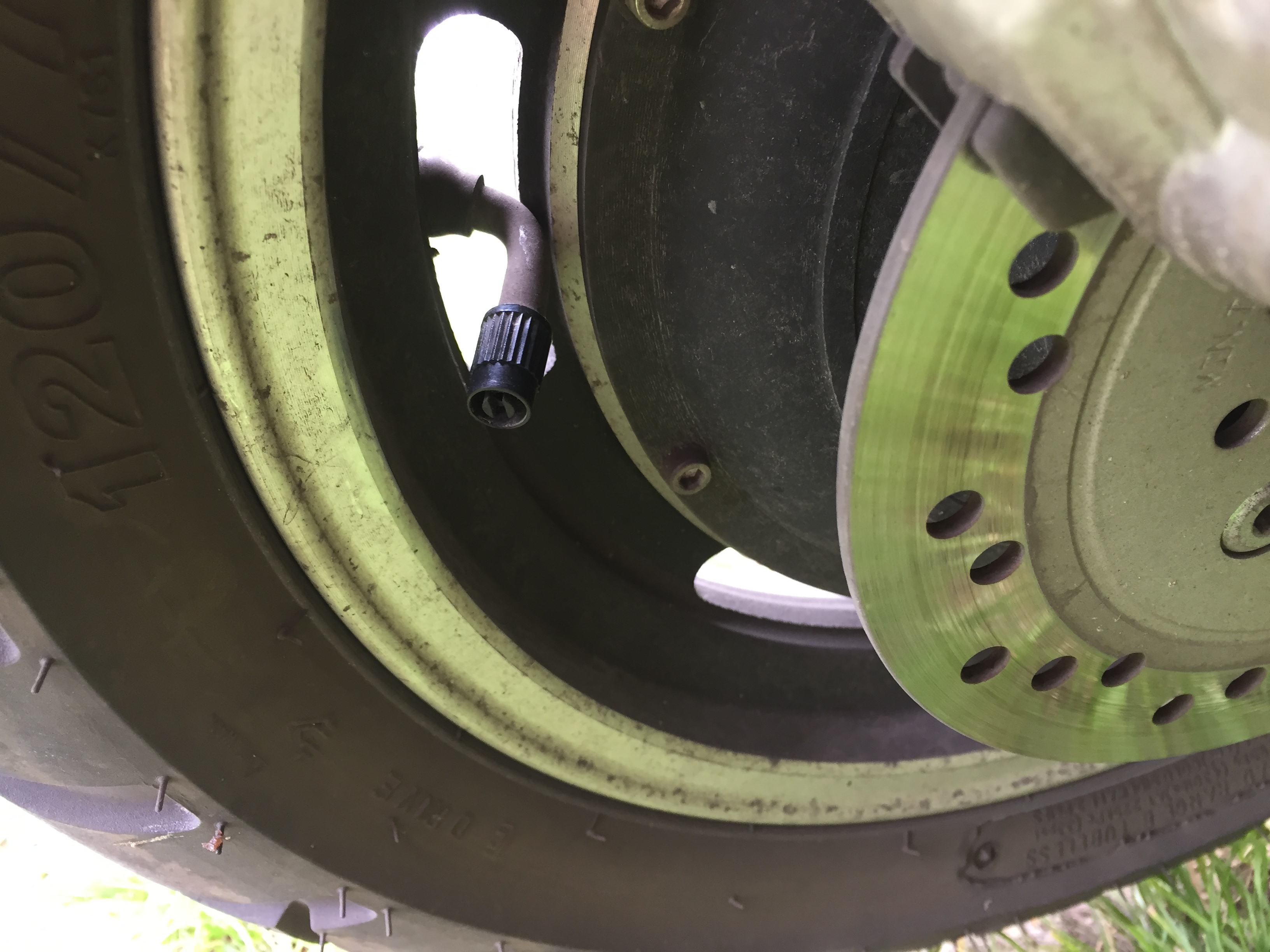 Das Ventil meines Hinterreifens ging Mitte Juni kaputt. Naiv wie ich nun mal bin, dachte es wäre ein einfacher Defekt, fahre ich zur nächsten Motorrad-, bzw. Moped Werkstatt um das Ventil austauschen zu lassen. Ich hatte das gleiche Problem auch schon mal mit dem Vorderreifen. Dort wurde es ohne Probleme in knapp 60 Min. gewechselt. Die Felge beim Hinterreifen schaut halt nur leider ganz anders aus. Das Ventil wurde beim Einbau schief durch die vorhandene Öffnung eingebaut(siehe Bild).
