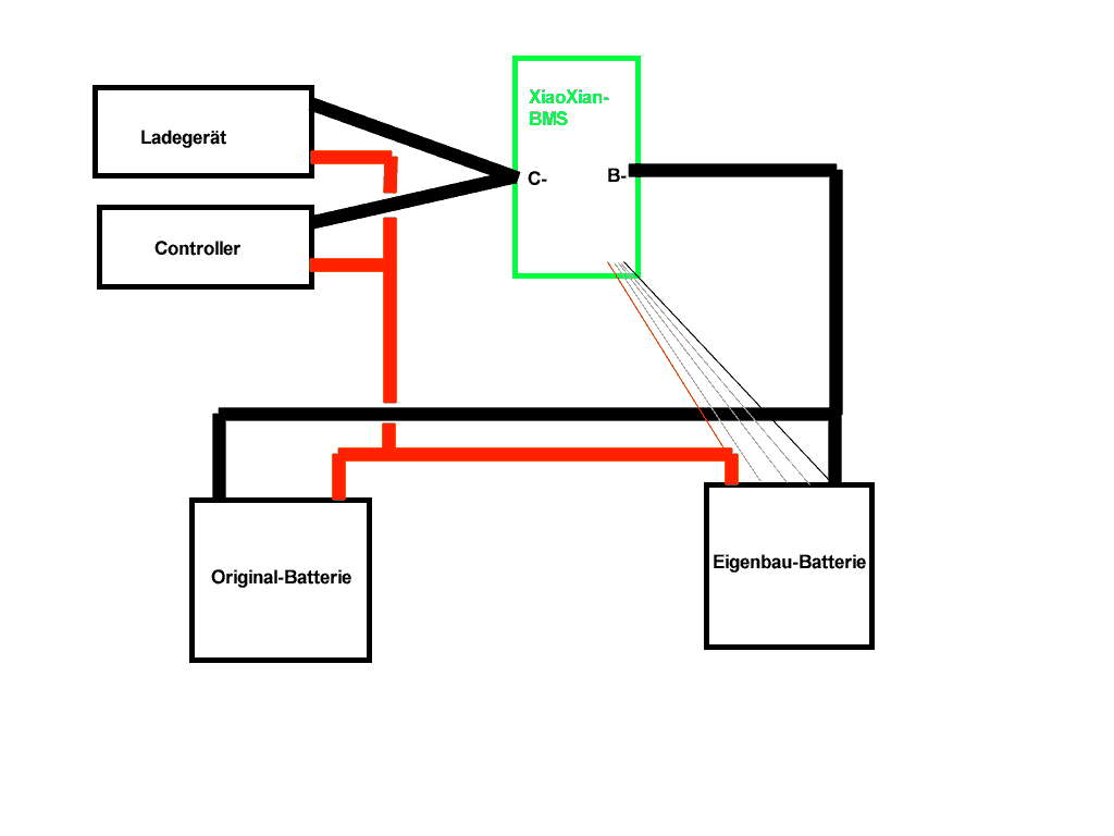 Jetzt kenne ich nur das XiaoXian BMS, das Du auf Batterie 2 drauf hast. Wo ist das BMS von Batterie 1? Ins Batteriegehäsue integriert? Dann muss Dein Testsetup folgendermaßen Verbunden sein - rot ist Plus, schwarz ist Minus: Wie Du gut sehen kannst haben Original- und Eigenbau-Batterie so keine Chance, unterschiedliche Spannungen zu haben