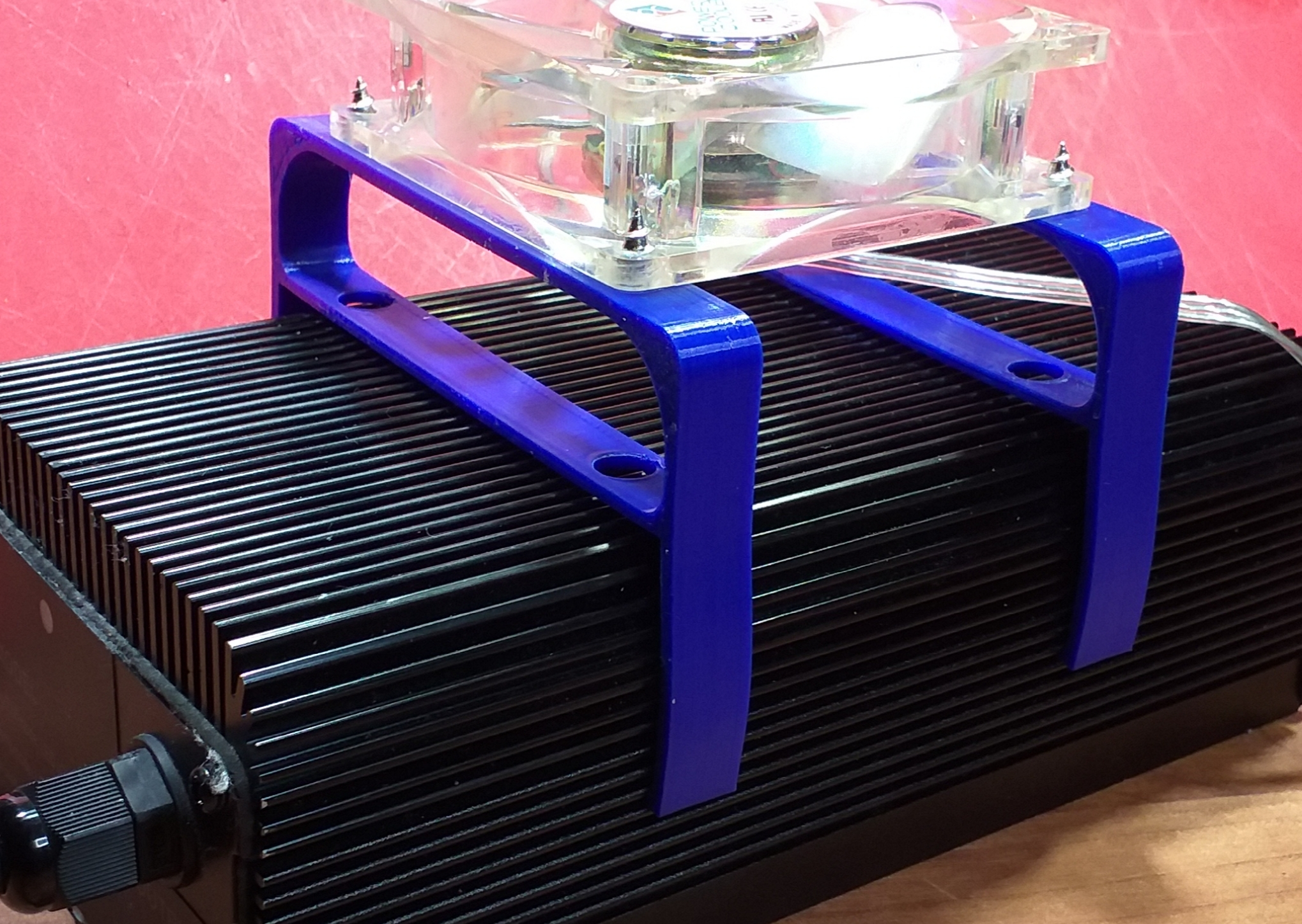 Für all die, die sich an der (fast schon heißen) Temperatur des Ladegerätes stören, habe ich einfache Aufsteckklemmen für 80mm Lüfter entworfen.