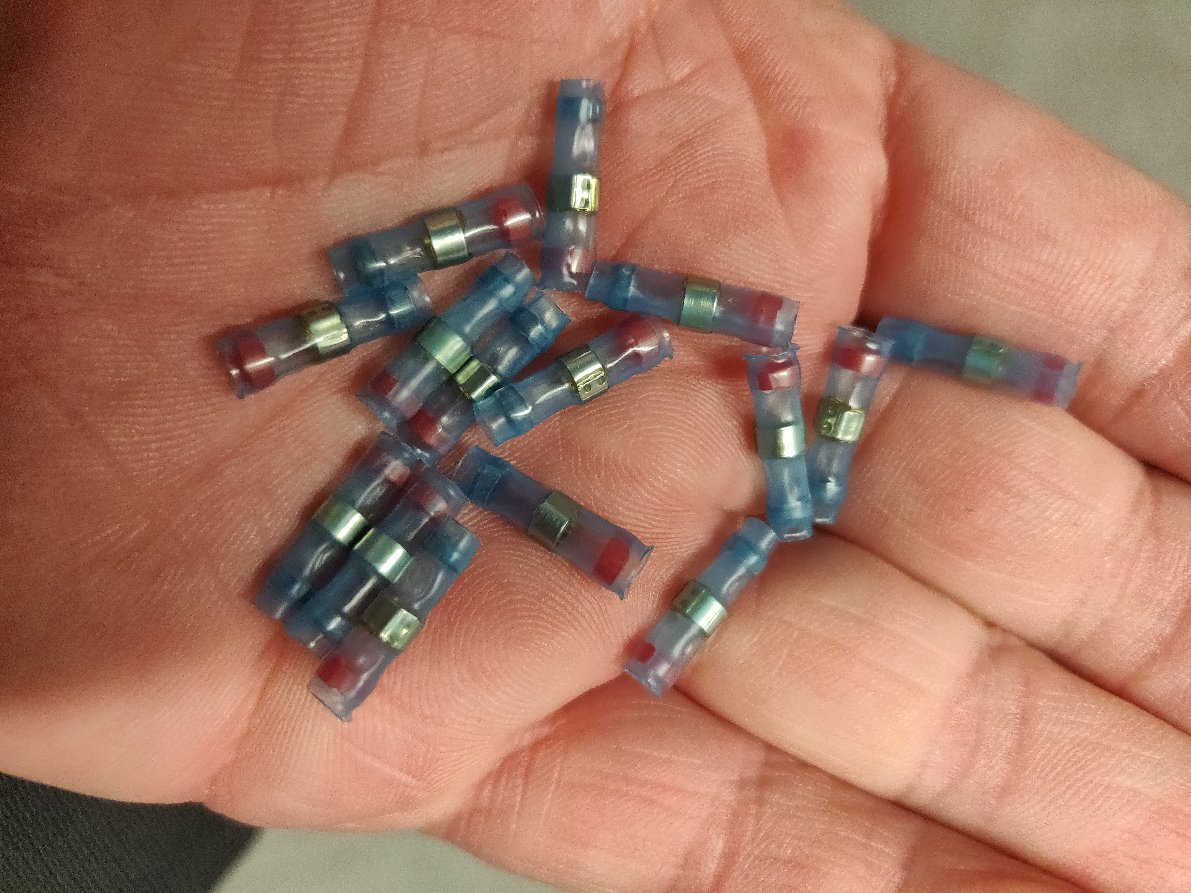 Die alten Stecker lagen dabei. Sie sind wohl herausgetrennt worden, weil die Kabel direkt an den Steckern durchtrennt wurden. Man kann die Farbbelegung (die natürlich auf beiden Seiten des Steckers oft unterschiedlich sind) noch gut erkennen. Daher war es nicht so schwierig, sie testweise zu verbinden. Dazu habe ich erstmal Aderendhülsen drauf gemacht und Wago-Hebelklemmen verwendet. Die kann man gut nach Bedarf verbinden und trennen.