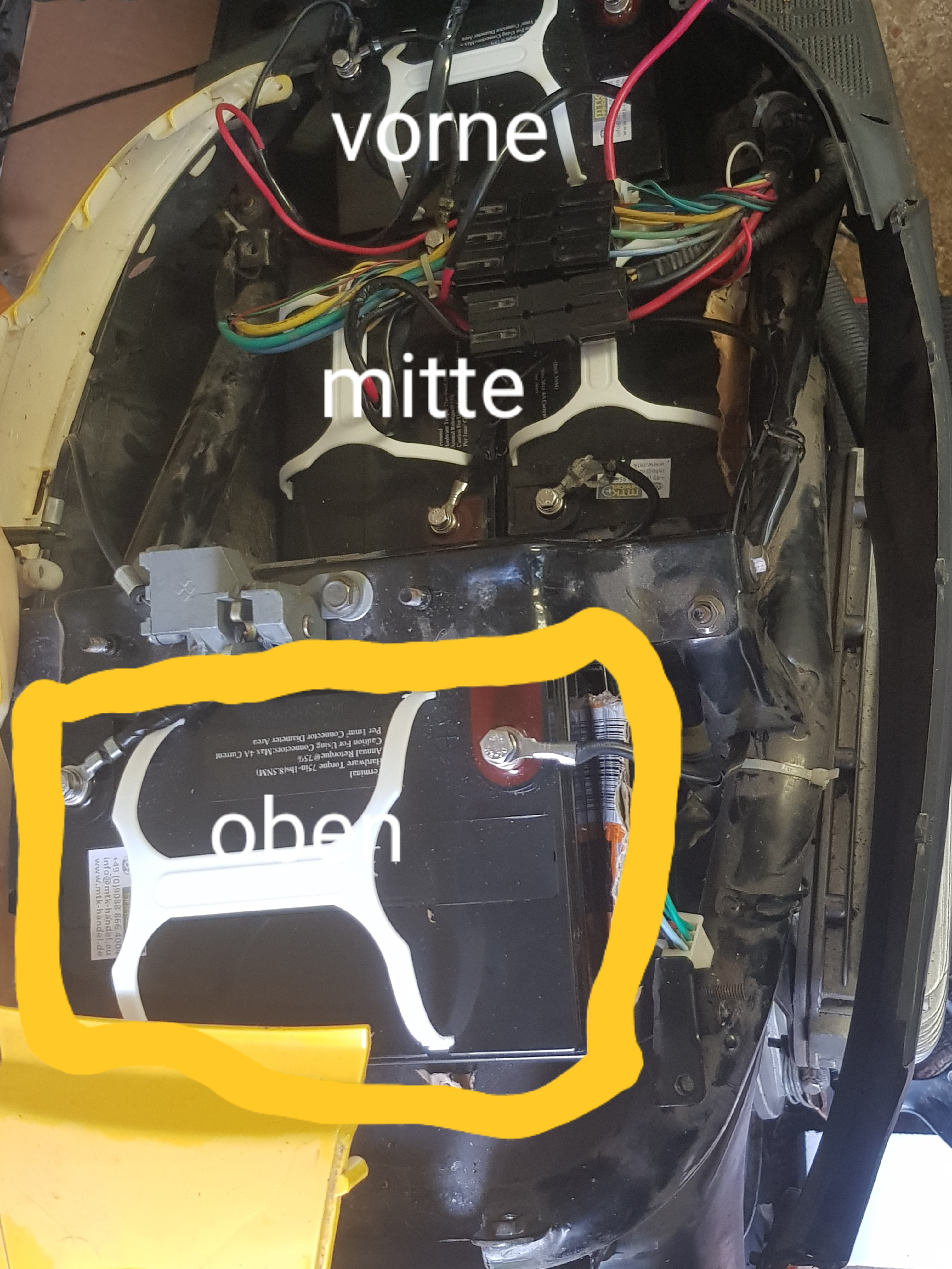 Da immer noch die Stecker zwei Batteriepole verdecken und das Minus-Kabel des hinteren oberen Akkus aus dem Foto raus geht, sehe ich darauf nicht, wie die Verbindungen jetzt laufen. Insbesondere von den dünneren Ladebuchsen-Kabeln sehe ich nur einen Anschluss an vorne Plus und der ist Schwarz obwohl er Rot sein müsste. Wo ist denn der Andere mit der roten Leitung verschraubt?.