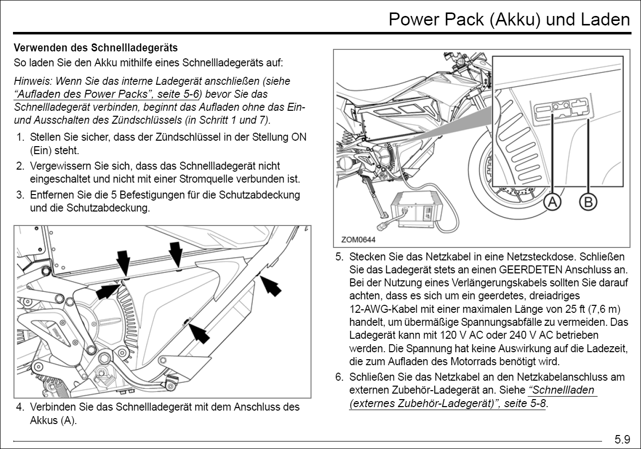 Ich weiß nicht, ob das die FX auch hat: Über dem Motor gibt es bei S und DS einen dicken fetten braunen Anderson Stecker, der aber eigentlich für externe schnellere Lader gemacht ist, die auch mit BMS kommunizieren. Denn zwischen den fetten Strompolen ist ein kleiner Mehrfachstecker, an dem Kommunikationsleitungen angeschlossen sind. Es gibt einen TC-Lader mit 3,3kW für die Zeros, den auch Otten im Programm hat. Der lässt sich dort einstecken.