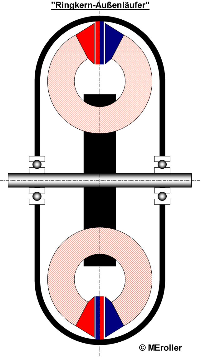 Womöglich wäre dann die an einem Punkt offene Ringkern-Variante die Lösung, wo die Permanentmagnete dann im offenen Spalt rotieren? Ups, das hätte ich womöglich gleich zum Patent anmelden sollen