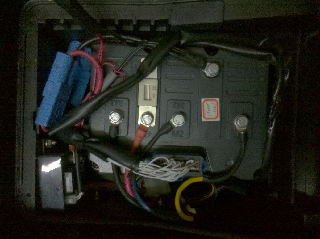 Das ist die Streifensicherung vom Sevcon Controller. Auf der vorderen Batterie ist noch eine 50A Streifensicherung E-Max seitig verbaut. Eventuell liegt eine kleinere 100A Streifensicherung (ist 'mal bei einer Modellpflege geändert worden) in der roten Plusleitung von der vorderen Batterie. Mußt schon die schräge und waagerechte Batterieabdeckung abbauen und nicht zuviele Nasen abbrechen - wird eh passieren ist aber auch nicht weiter schlimm.