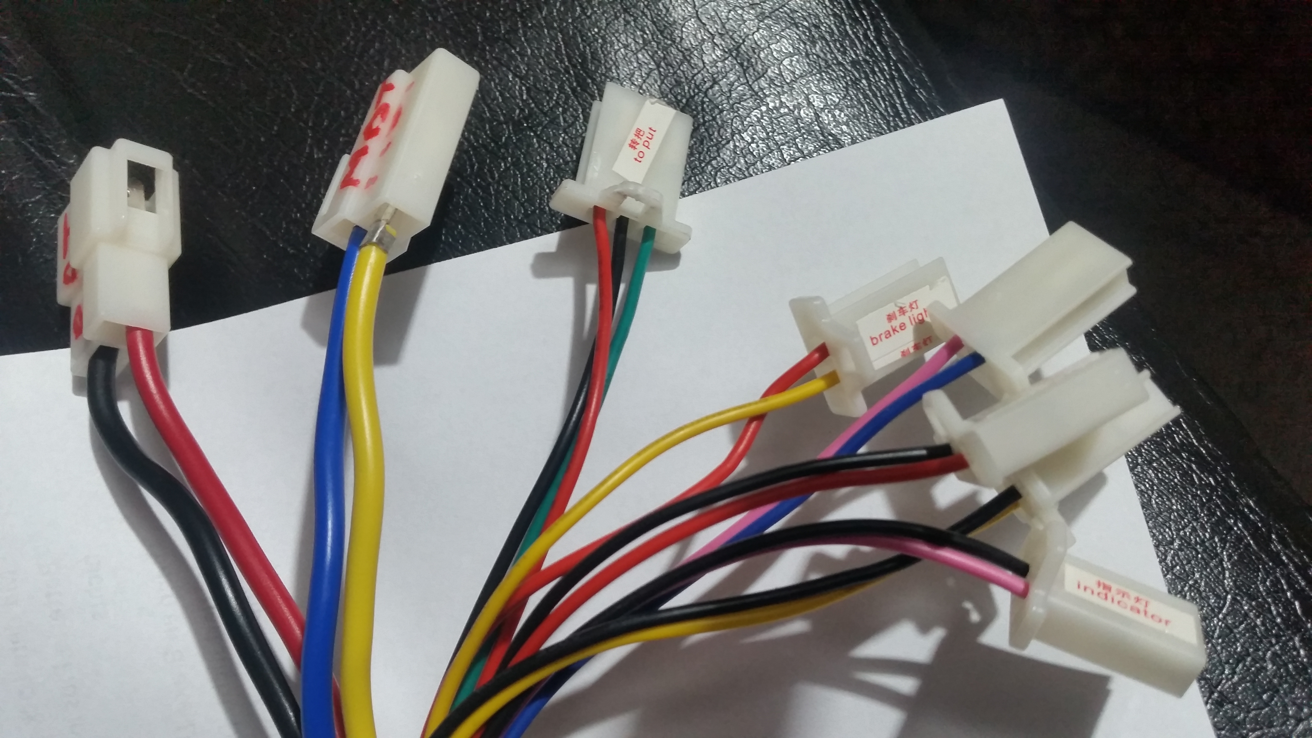 Wenn an Brake-Light Spannung (gegen Minus) für das Bremslicht anliegt, läuft der Motor garantiert nicht. Dann wäre die Brake-Leitung irgenwie zu schalten, dass das Bremslicht aus geht. Indikator könnte für die Richtungsblinker sein oder Betriebsanzeige.