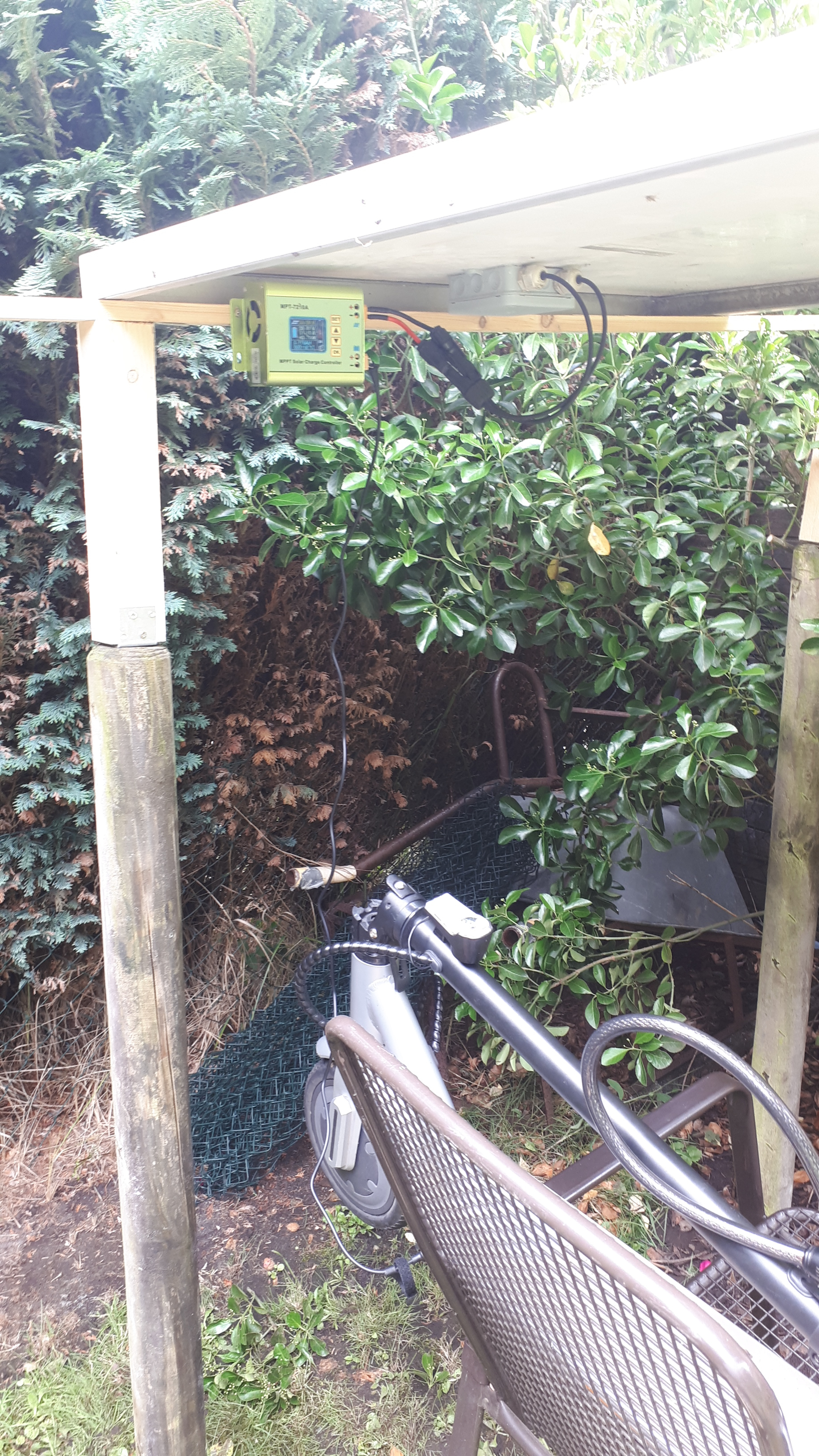 Ich hab mir ein Unterstand für meinen E Roller gebaut, dank günstigen Angebot und einfacherer Reparatur kann ich da durch einen mpt 7210A Regler mit einem alten 150 Watt Modul direkt in die Fahrzeuge laden.