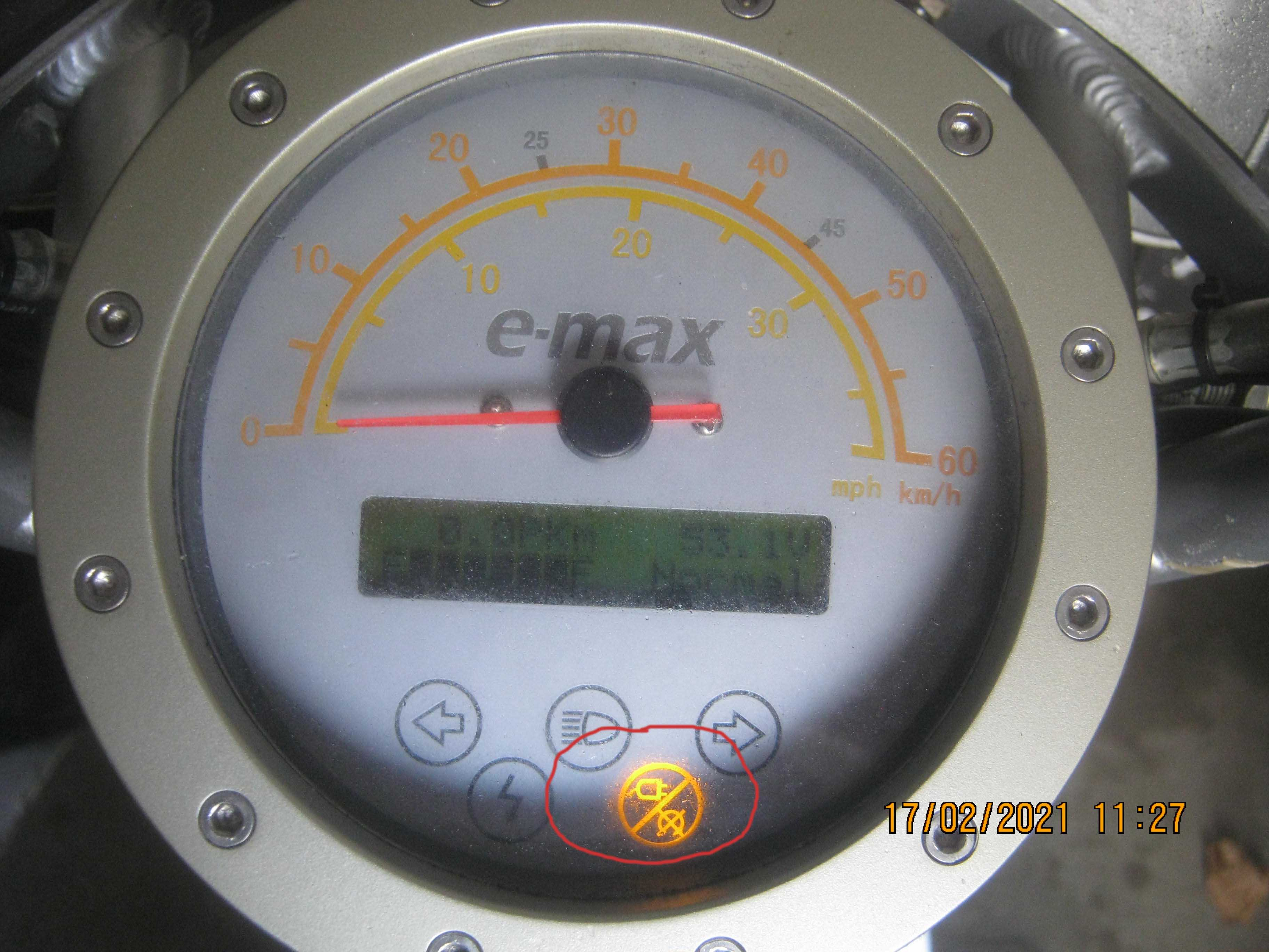 Unter 3.4 "Malfunction messages in the speedometer display" sind die Symbole erklärt. Entweder Batterie leer (Steckersymbol) - was bei 53V nicht sein kann - oder es ist Etwas zu heiß geworden. Oder der Hallgriff gibt bei Zündung EIN eine zu hohe Spannung ab - jumpstart Verhinderung.