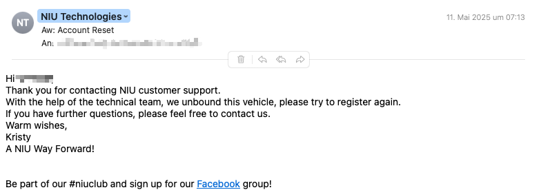 Also, bei mir funktionierte es auch ohne Kontaktaufnahme zu NIU. Merke auch keinen Unterschied von wegen "Zweitaccount". Ich kann alles machen, was in der App an Aktionen und Funktionen angeboten wird.